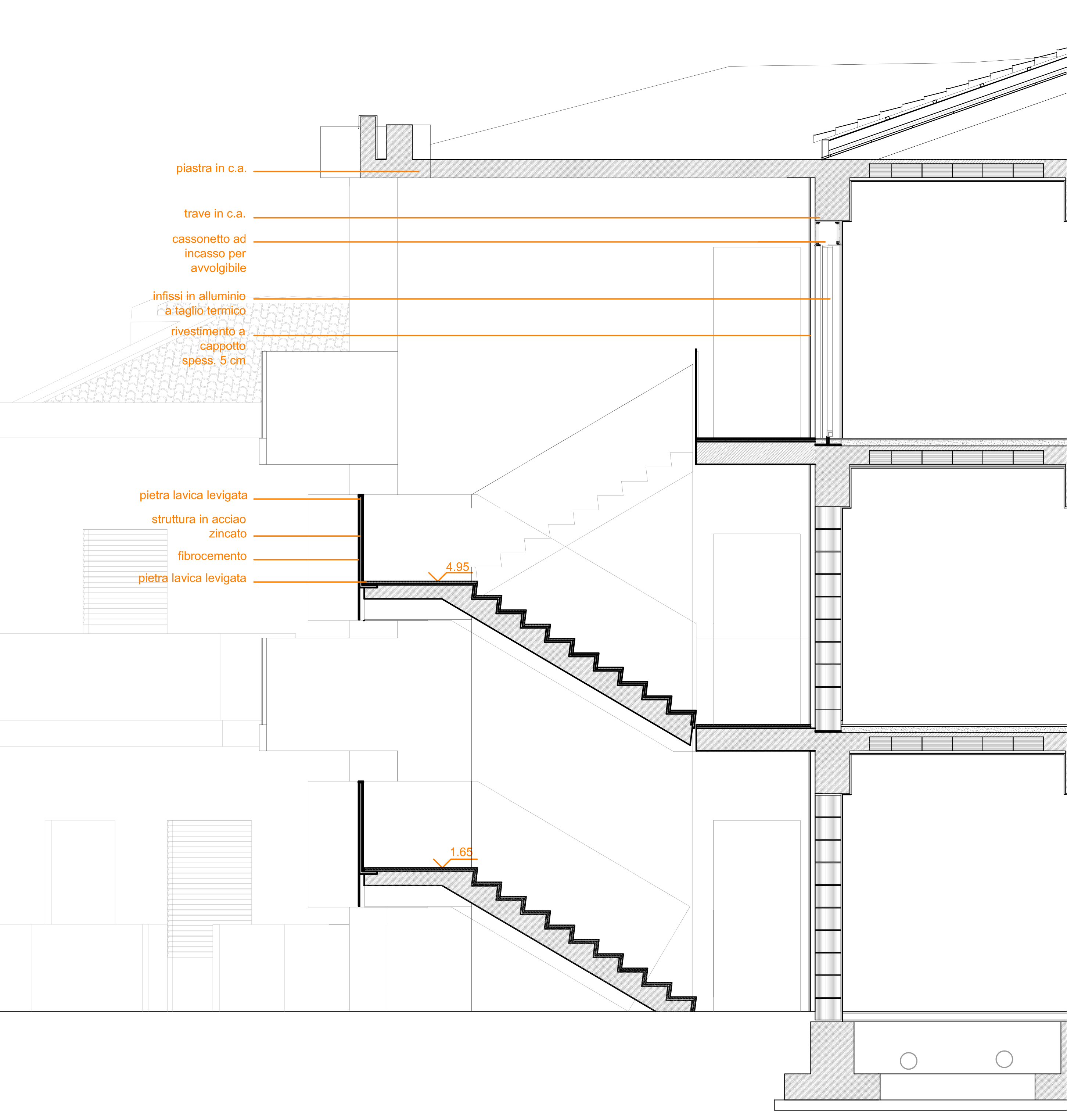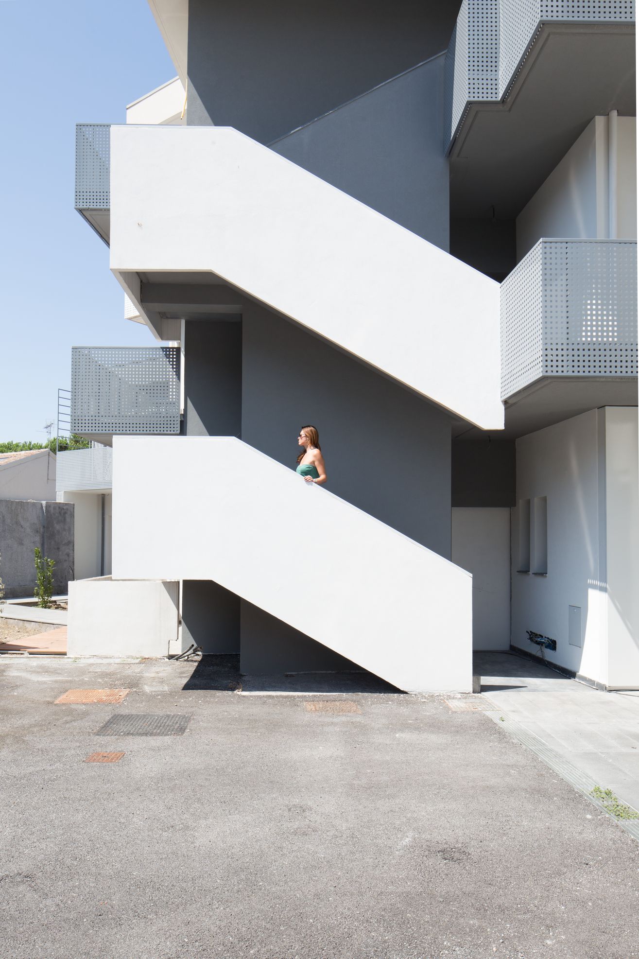 A presenziare sul volume interamente intonacato di bianco, è la scala esterna il cui parapetto bianco e pieno in pannelli di fibrocemento montati su struttura in acciaio zincato, si avvolge come un nastro, intorno a un setto in calcestruzzo intonacato di grigio. Il bianco puro della balaustra, nel dar luce si alterna al grigio dalla tonalità vicina alla pigmentazione della pietra lavica e caratterizza il collegamento tra i vari piani. Le ringhiere degli spazi privati sono invece realizzati in lamiera zincata macroforata e verniciata e lasciano filtrare la luce creando un gioco di chiaroscuri ed alternanze sulle facciate.