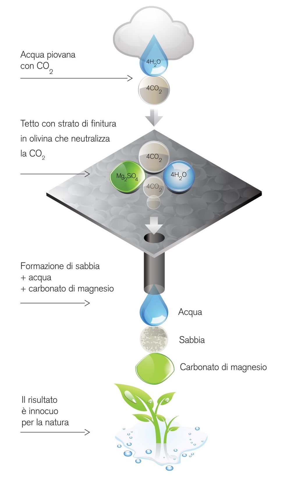 Derbicolor FR Olivina è la membrana che possiede sullo strato superficiale graniglia di olivina, minerale largamente presente in natura in grado di neutralizzare la Co2 presente nell’atmosfera. La Co2 che si deposita sul tetto insieme alla pioggia reagisce con l’olivina trasformandosi in diossido di silicio e carbonato di magnesio, del tutto innocui per l’ambiente. Si pensi solo che secondo lo studio del Dott. Olaf Schuiling, Dipartimento di Scienze della Terra dell’Università di Utrecht, 1 kg di olivina ha la capacità di assorbire 1,25 kg di Co2, tutto a favore della protezione del pianeta.