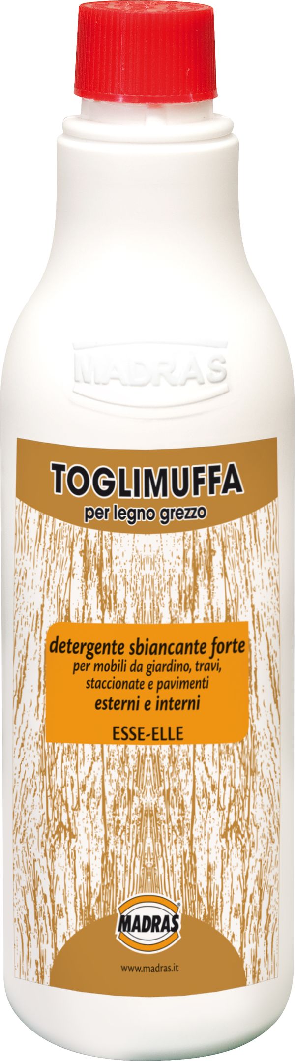 Esse-Elle Toglimuffa è il detergente sbiancante forte di New Madras >> che distrugge muffe, licheni, funghi, colonie di batteri e igienizza. Può essere utilizzato su legno grezzo di qualsiasi natura come travi, colonne, pareti, pavimenti, mobili da giardino e rifiniture.