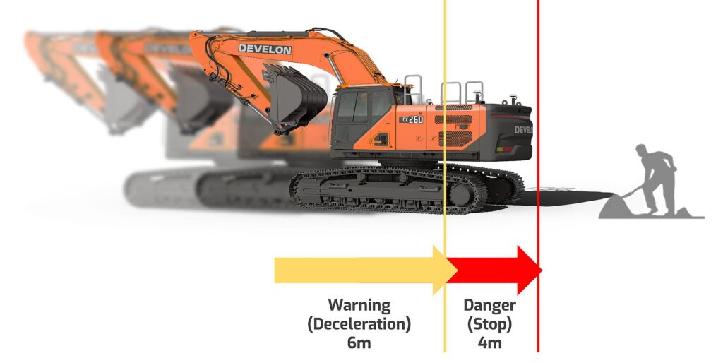 Il sistema interviene automaticamente arrestando i movimenti di rotazione e retromarcia dell’escavatore nel momento in cui viene rilevata la presenza di una persona all’interno di un raggio di 4 metri dalla macchina.