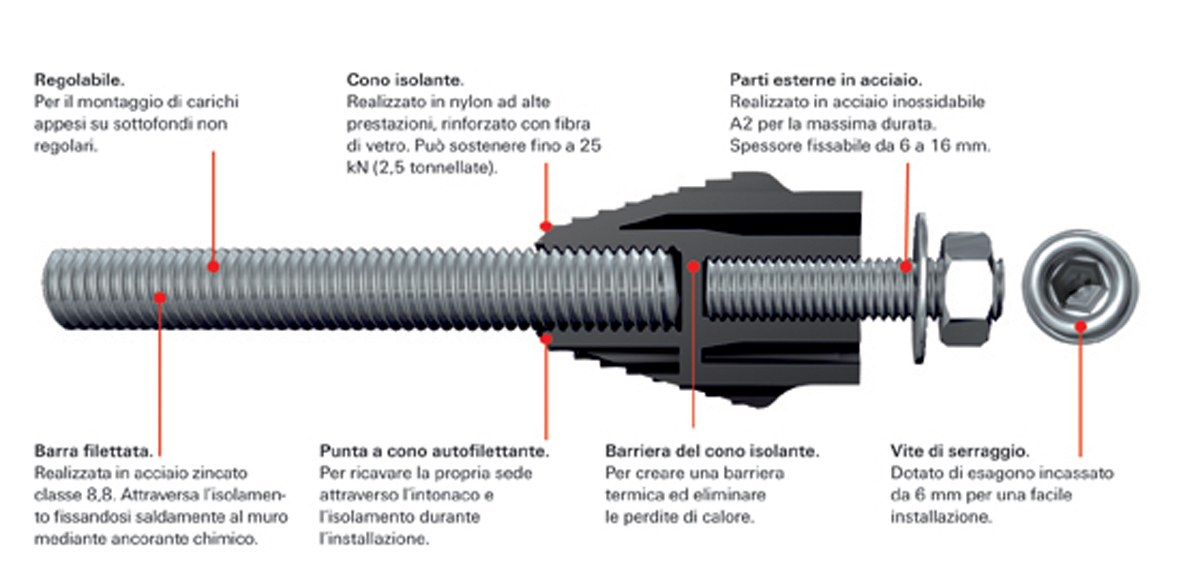 Grazie al cono isolante, in nylon ad alte prestazioni e rinforzato con fibra di vetro, il flusso termico attraverso la parte metallica del fissaggio viene interrotto e non si verificano perdite di calore.