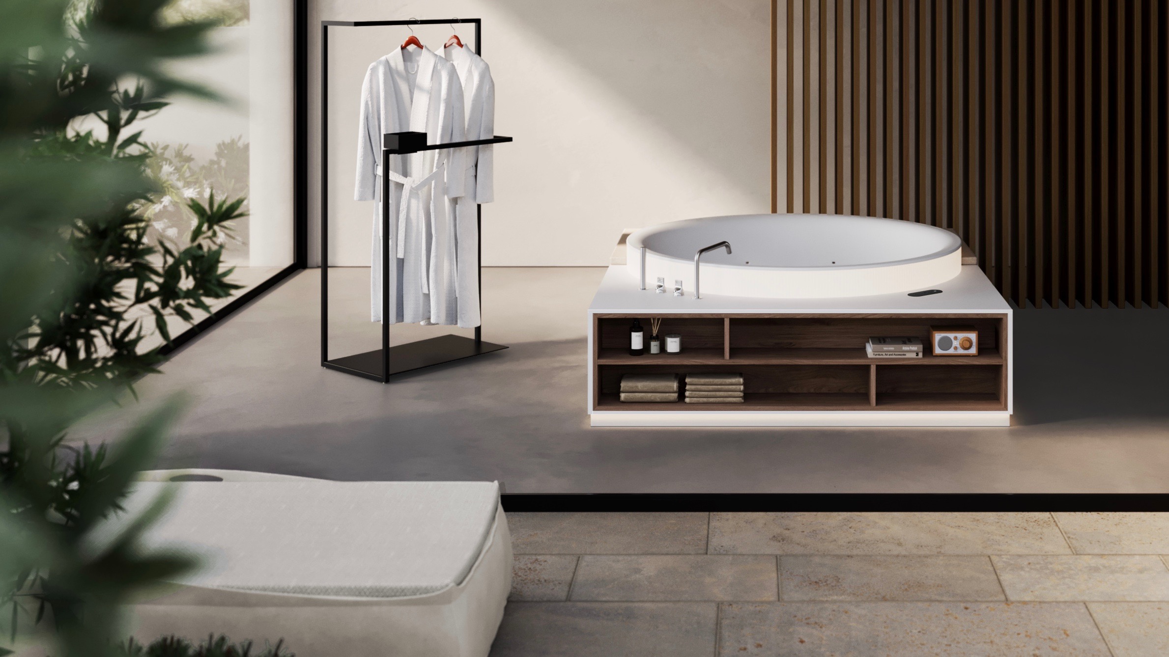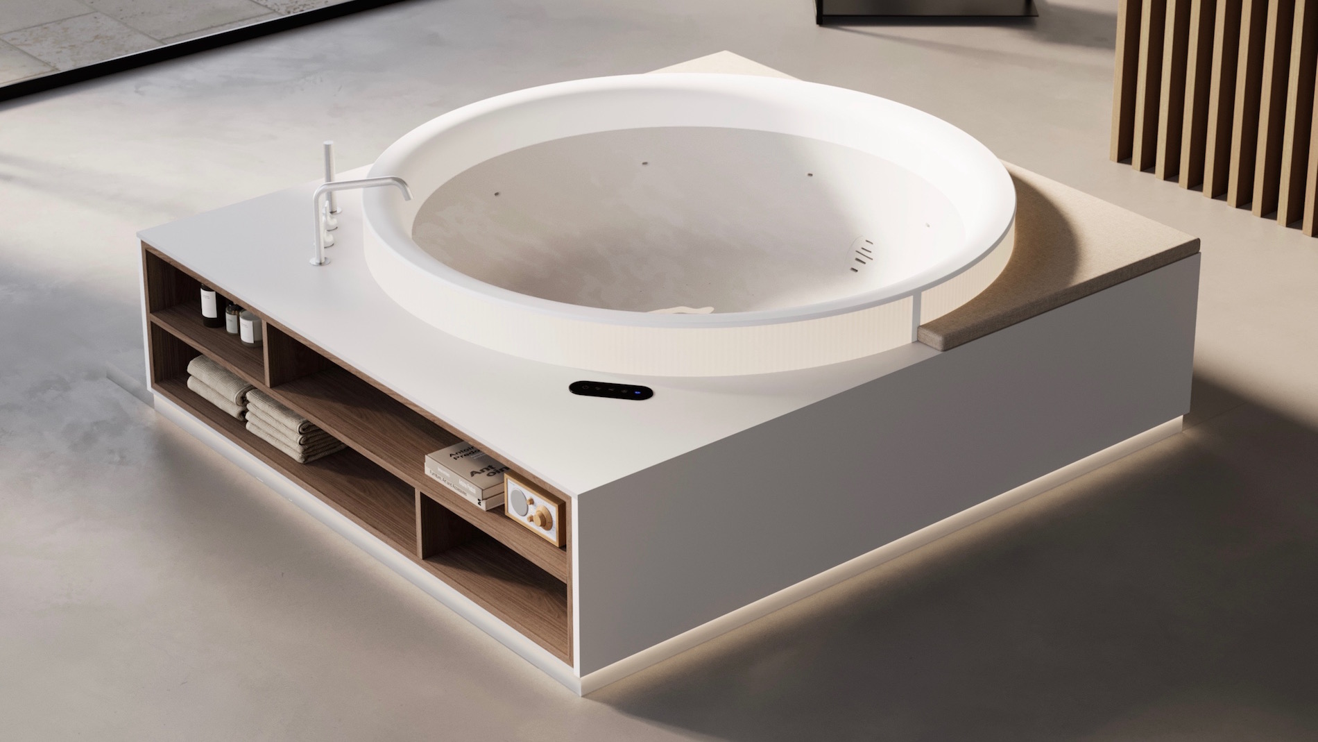 La luce, integrata perfettamente all’interno delle superfici, è la particolarità di questa vasca ed è utilizzata sia a scopo terapico sia per creare atmosfera attorno alla piscina grazie a una corona illuminata che ne mette in risalto il bacino. Pensata come vero elemento di arredo, è disponibile in una unica dimensione 160×175 cm con un bacino dal diametro di 145 cm, può essere collocata in centro stanza oppure in appoggio a parete e dispone di componenti che esaltano l’esperienza di relax e massaggio dell’utente con ampie superfici organizzate e un comodo mobile a giorno.