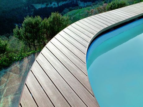 Immersa in un incantevole contesto naturale, la piscina è stata oggetto di un intervento di rinnovo della pavimentazione esterna ammalorata, sostituita con le doghe in Wpc, un materiale innovativo composto a base di legno che associa alla naturalezza del legno i vantaggi delle nuove soluzioni polimeriche, che rendono le doghe particolarmente resistenti nel tempo e dotate di stabilità dimensionale, senza dover ricorrere a manutenzioni successive la posa in opera. Eco-compatibile e riciclabile al cento per cento anche nelle colorazioni, Naturinform Kernige si presta ad applicazioni in ambienti in cui vi sia presenza di acqua e cloro in quanto resistente alla corrosione di queste sostanze; grazie alla superficie antiscivolo, la doga è inoltre indicata per l’impiego a bordo piscina perché, anche se bagnata, assicura l’aderenza, e la superficie anti-scheggia consente di camminare a piedi nudi in sicurezza; un piacere completo favorito anche dalla texture della superficie, ruvida al tatto.