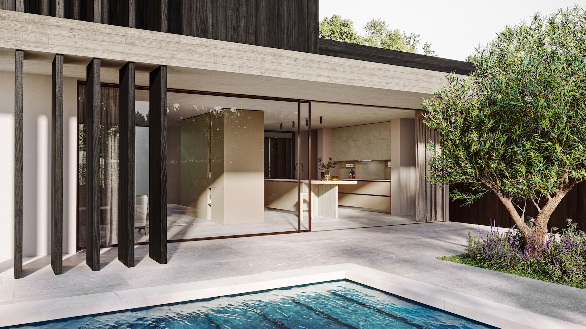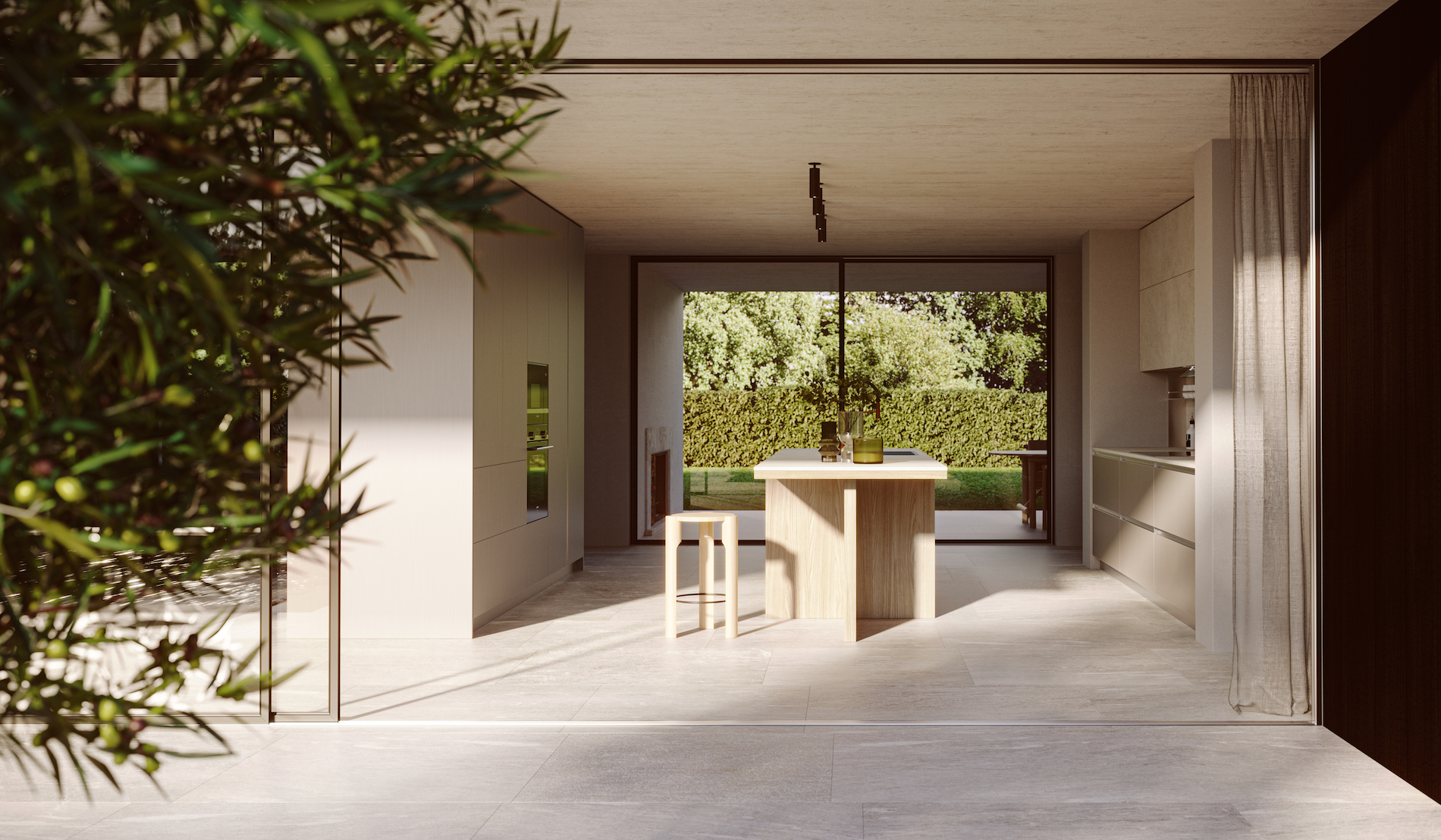 Per Doimo Cucine la natura dialoga con i materiali grezzi dell’architettura: legno carbonizzato, cemento effetto cassero e la solida pietra dei pavimenti.