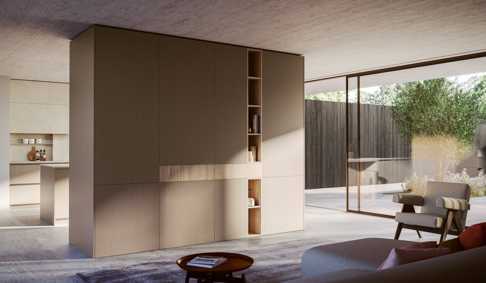 Negli interni, la natura è richiamata da finiture a tema, a volte con elementi appositamente costruiti, come il piano snack. Ha un top composto da una lastra unica di MDi Ananda, sostenuta da una struttura di pannelli in Synchroface olmo Paglia, fissata alle basi dell’isola.
