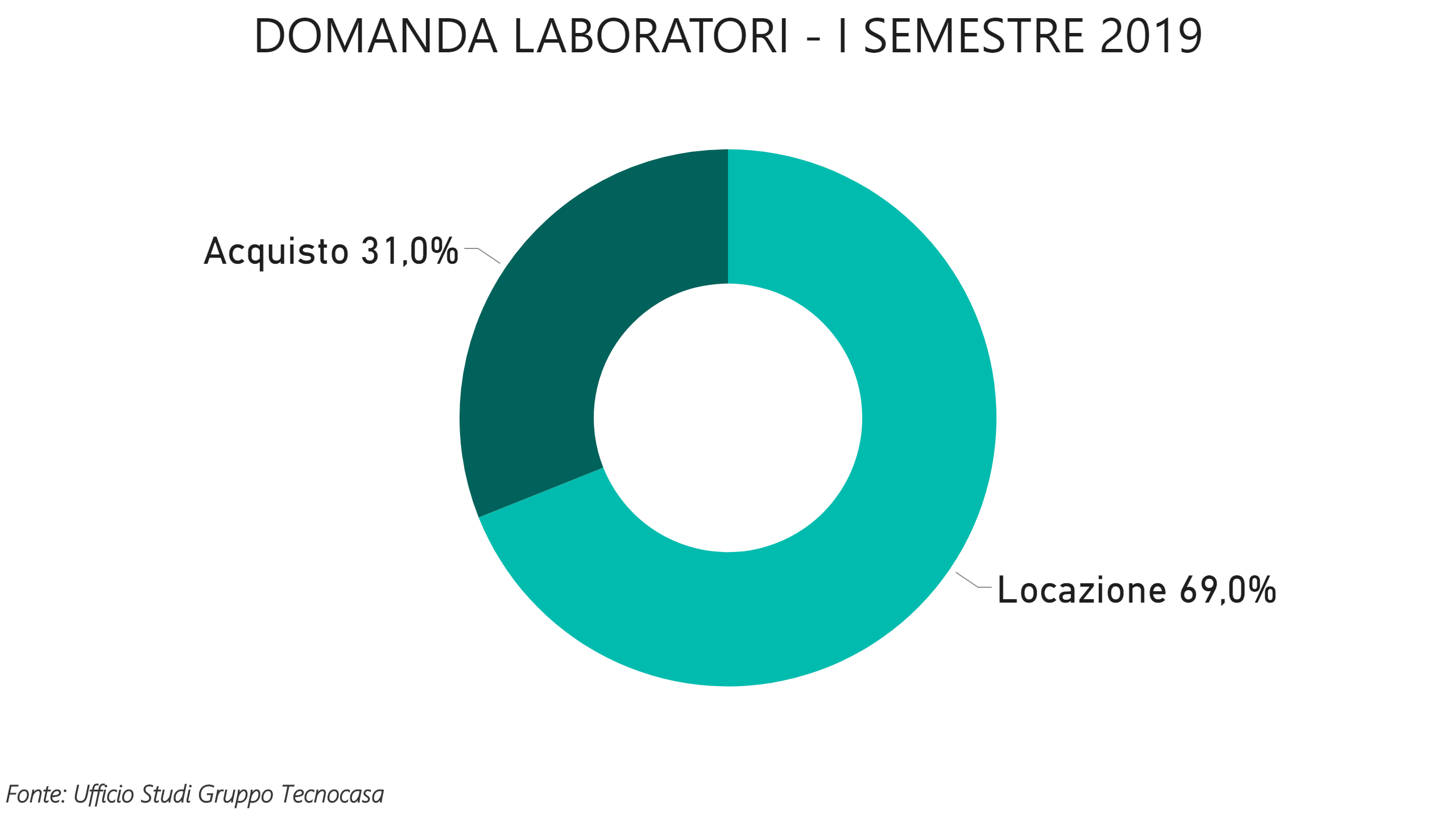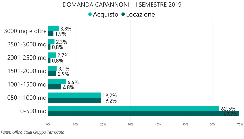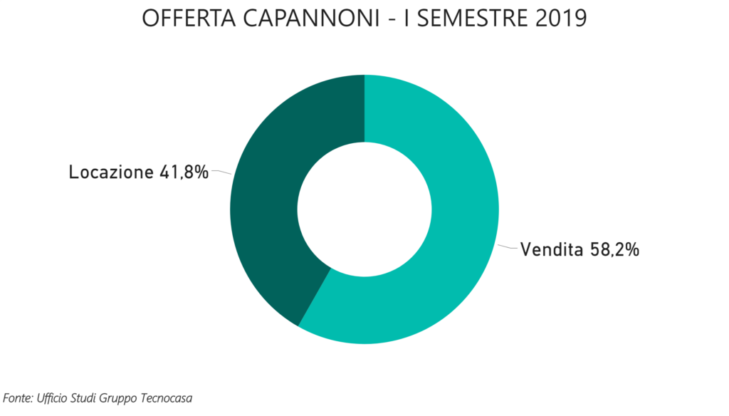 Secondo l’ufficio studi Tecnocasa nel primo semestre 2019 il segmento dei capannoni registra 67,8% di richieste in locazione e 32,2% di acquisto segnando così una leggera diminuzione, rispetto al secondo semestre 2018, della percentuale di chi cerca per compare.