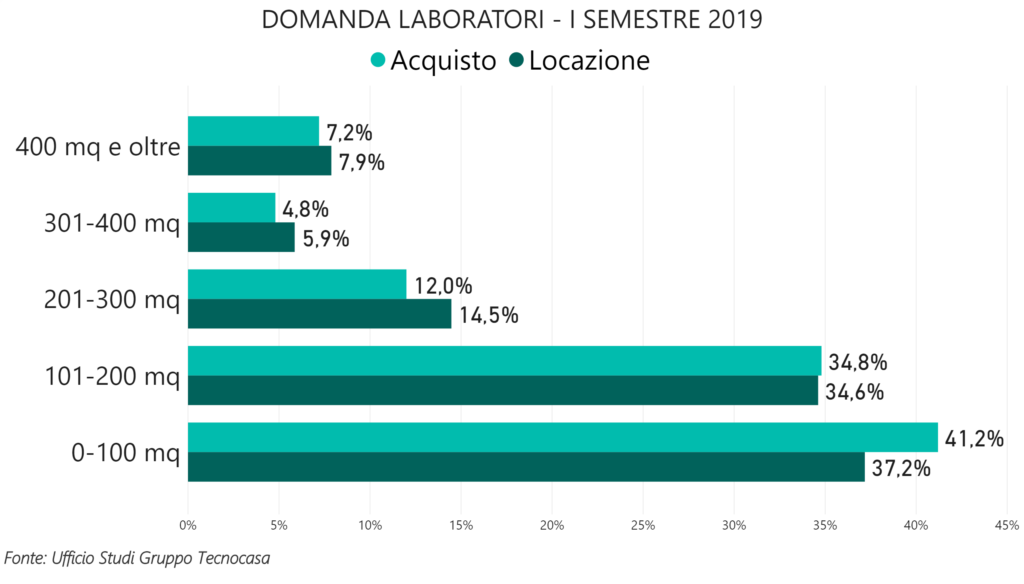 La locazione è l’opzione preferita da chi cerca i laboratori con il 69% che opta per questa soluzione. Il taglio più richiesto è quello inferiore a 100 mq. Si registrano un 24,7% di acquisti per investimento, seguito da un 17,2% che vi colloca attività artigianali. L’11,5% insedia studi professionali. Percentuale simile (12,2%) per chi opta per la locazione, mentre per le lavorazioni artigianali c’è un 16%.