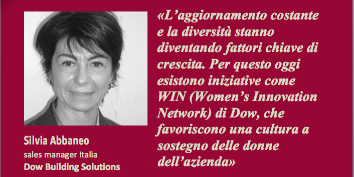 Le aziende secondo Silvia Abbaneo «devono attrarre e trattenere i migliori talenti e le risorse necessarie per vincere in un settore altamente competitivo. L’aggiornamento costante e la diversità stanno diventando fattori chiave di crescita. Per questo oggi esistono iniziative come WIN (Women’s Innovation Network) di Dow, che favoriscono una cultura a sostegno delle donne dell’azienda per la condivisione di esperienze, lo sviluppo professionale così come l’accesso a leadership e posti di alta responsabilità». Una più ampia presenza femminile in edilizia può essere d’aiuto secondo la Schönthaler «anche per gli indicatori di qualità nelle gare di appalto, dove il tema della sostenibilità e salubrità è molto importante; le donne dimostrano una maggiore sensibilità verso l’utilizzo di materiali che corrispondono a questi criteri».