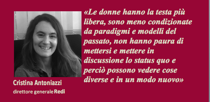 Per Cristina Antoniazzi, direttore generale di Redi, «il manager di oggi deve essere in grado di adattarsi a regole del gioco che cambiano repentinamente e in questo senso credo che le donne siano avvantaggiate poiché essendo arrivate più tardi a ricoprire ruoli importanti all’interno delle organizzazioni hanno la testa più libera, sono meno condizionate da paradigmi e modelli del passato, non hanno paura di mettersi e mettere in discussione lo status quo e perciò possono vedere cose diverse e in un modo nuovo».