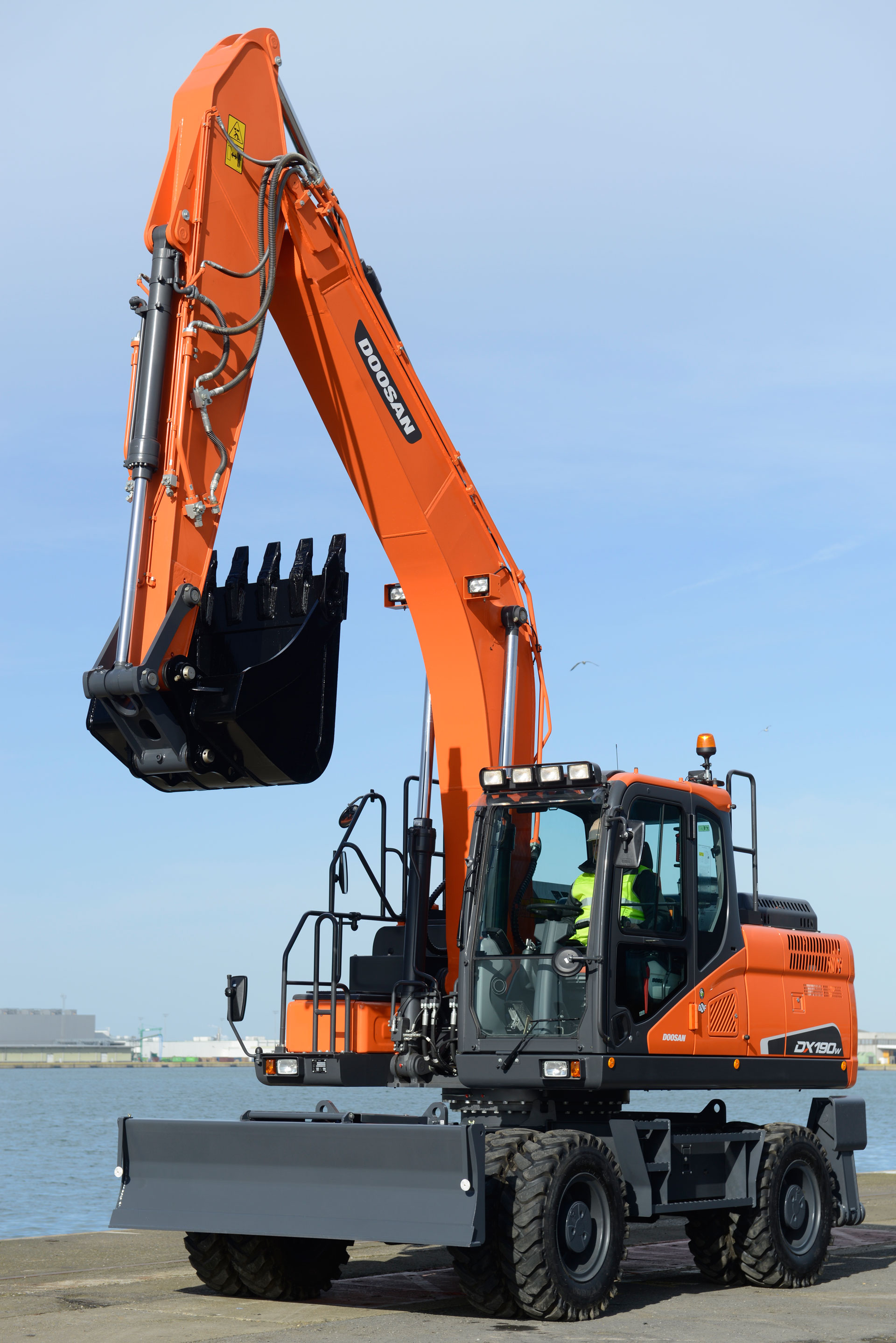 Assali Zf lunghi. Il Dx190w-5 è inoltre disponibile in versione opzionale con i nuovi assali Zf lunghi: con questa opzione la larghezza sale a 2,75 m, migliorando la capacità di sollevamento e stabilità, caratteristica utile nelle applicazioni che richiedono sollevamento frequente di carichi pesanti, oppure lavoro sopra o lungo trincee. In media, e in funzione del tipo di lavoro, le capacità di sollevamento crescono del 13%. Questa opzione è disponibile anche per il modello più grande Dx210w-5.