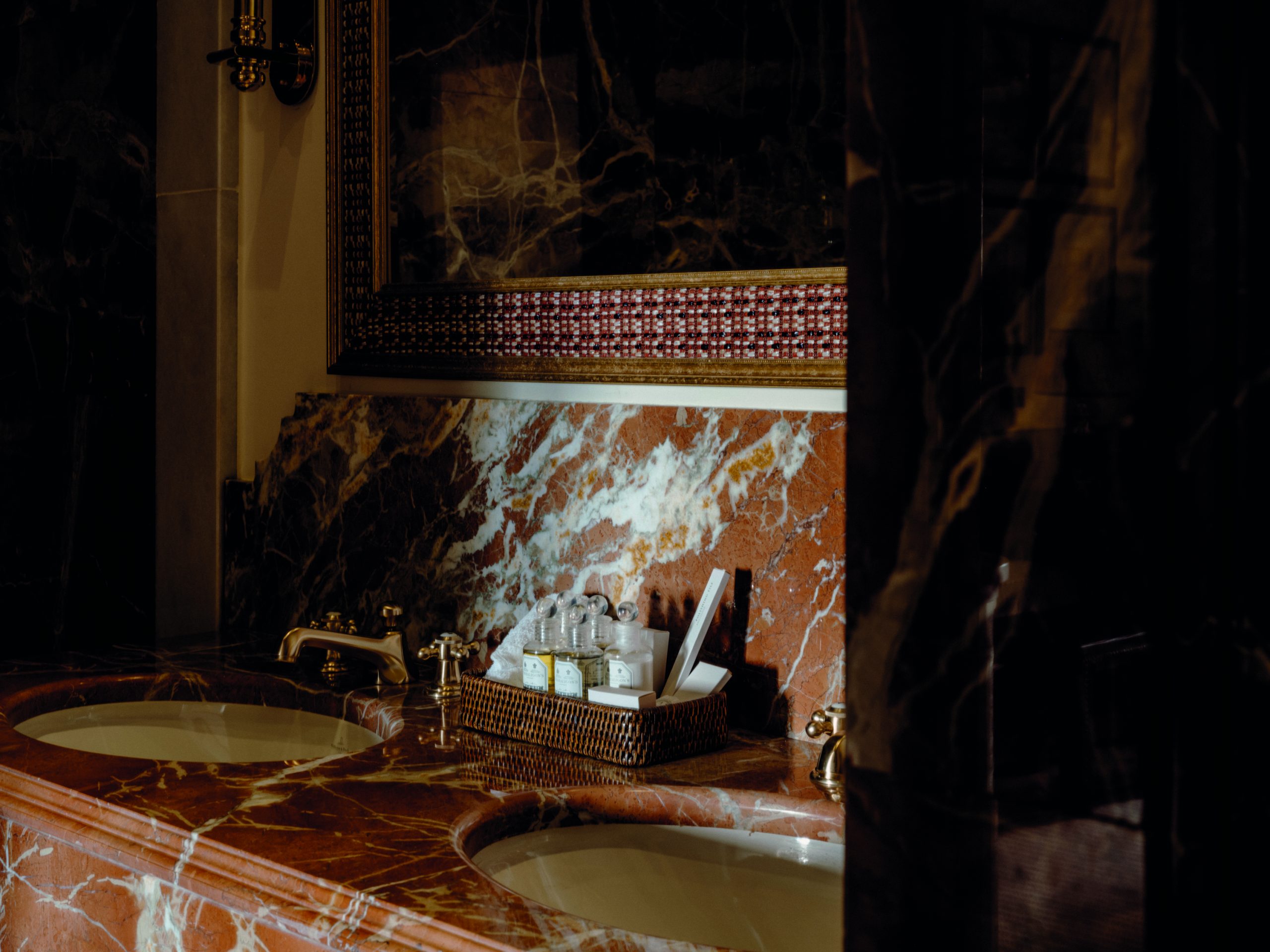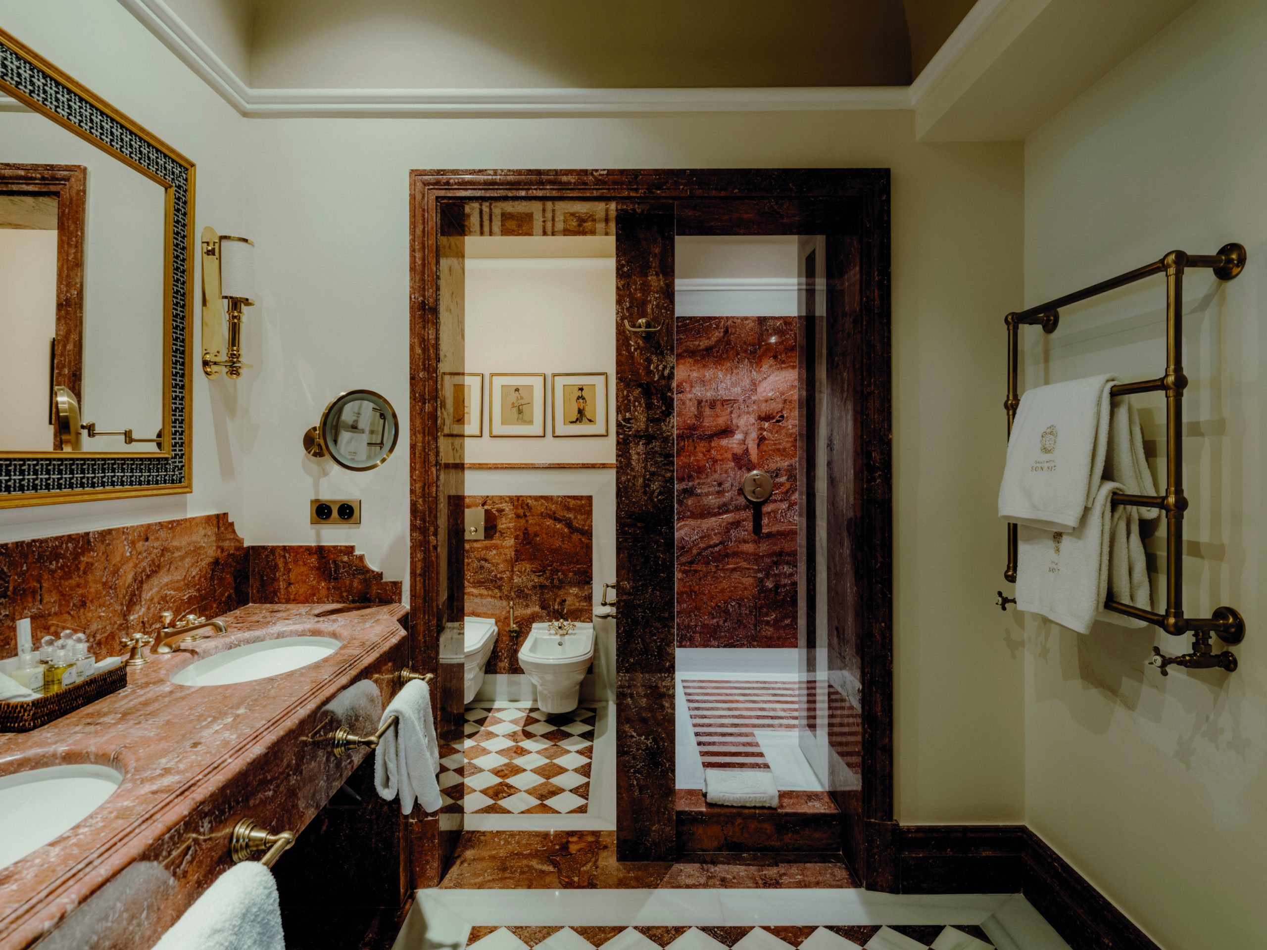 La serie di rubinetteria Madison di Dornbracht si inserisce perfettamente in questa magica atmosfera barocca. In uno dei bagni, ad esempio, la rubinetteria Dornbracht nella finitura Ottone spazzolato (Oro 23kt) definisce le tonalità dell’ambiente: il caldo colore dorato si riflette in diversi elementi della stanza.
