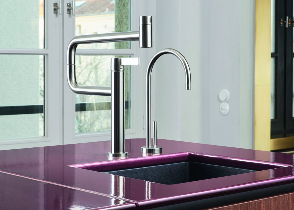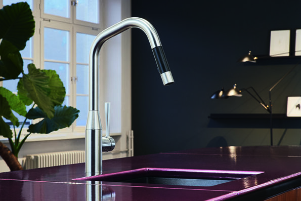 Grazie al loro design raffinato, i miscelatori Dornbracht si fondono in modo armonico nei diversi ambienti presenti in apmt, combinando l’estetica con la funzionalità e il comfort più assoluto. In cucina il miscelatore monocomando Pivot, installato sul lato destro del lavello, con il suo braccio lungo consente un ampio raggio d’azione e rende facile riempire pentole e contenitori. Accanto, il Water Dispenser della serie Tara Classic eroga acqua bollente a 93°, ideale per la preparazione rapida di caffè o tè, oppure fredda, filtrata in pochi secondi. Sul lato opposto il miscelatore monocomando Sync, dotato della funzione pull-down con doccetta, si inserisce in modo naturale nell’isola che ospita l’angolo cottura. La bocca estraibile verso il basso amplia il suo raggio d’azione, rendendo il lavoro quotidiano ancora più confortevole.