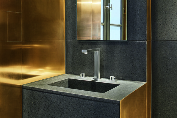 Per il mondo bagno, il sistema doccia Sensory Sky, garantisce un’esperienza sensoriale unica, ricreando l’atmosfera suggestiva di una doccia all’aria aperta. Ispirati da fenomeni metereologici e atmosfere naturali, vari tipi di pioggia, nebbia, luce e profumi si combinano dando luogo a straordinarie esperienze con l’acqua e risvegliando tutti i sensi. Completa l’area spa un elegante lavabo dotato di un miscelatore tre fori della serie Symetrics. Un miscelatore della serie Deque, con la bocca larga e piatta che fa sgorgare l’acqua con naturalezza come lo zampillo di una sorgente, è invece presente nell’atrio del secondo bagno, completamente rivestito di piastrelle dorate. In una suggestiva interazione di luci e ombre, la finitura cromata del rubinetto si riflette sulla superficie piatta dei rivestimenti, dando vita ad un gioco sfavillante di rifrazione.