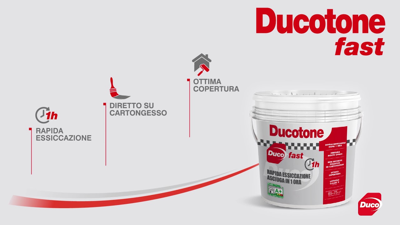 «Grazie al prezioso lavoro fatto dal nostro reparto R&D abbiamo creato una nuova formula che rende Ducotone Fast sovraverniciabile dopo solo un’ora dall’applicazione della prima mano Un risultato davvero impressionante se si considera che, in media, una comune pittura asciuga in 6/8 ore. In questo modo vogliamo aiutare i professionisti che scelgono i nostri prodotti a ottimizzare il proprio lavoro, portando a termine in una giornata un lavoro che fino a oggi ne richiedeva due»