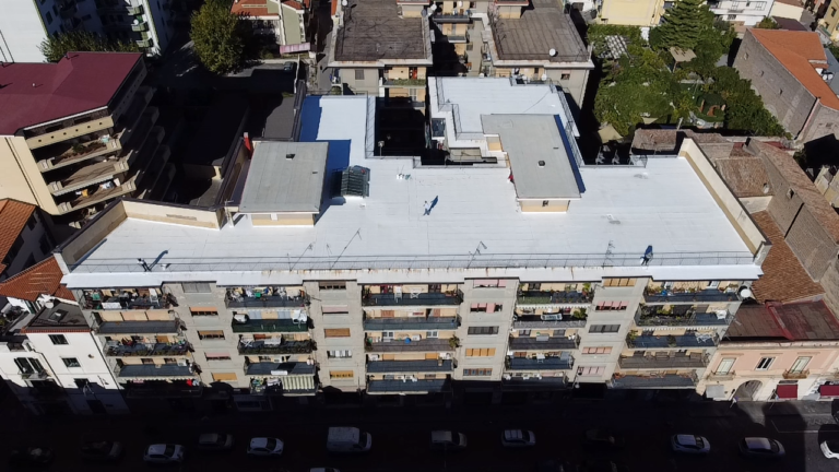 Le coperture dell’edificio, sia sul solaio del piano primo sia sul vano impiantistico, sono realizzate in lamiera di alluminio a giunti drenanti con spessore pari a 10/10. Tale manto di copertura viene montato sopra il solaio senza necessità di guaina impermeabilizzante, che viene invece prevista al di sotto dei canali di gronda che presentano giunti siliconici e altri punti deboli, attraverso i quali l’acqua si può infiltrare all’interno dell’edificio. Il manto di copertura è realizzato da lastre che si incastrano a scatto l’una sull’altra, senza necessità di doverle forare; tale manto, montato su un graticcio ligneo supportato da piedini metallici, regolabili in altezza, garantisce, oltre che l’impermeabilità e la tenuta all’acqua, anche la pedonabilità della copertura. L’isolamento termico della copertura è realizzato con pannelli in lana di vetro (spessore 15 cm) posti fra solaio e manto di copertura, nell’intercapedine formata dai piedini regolabili.