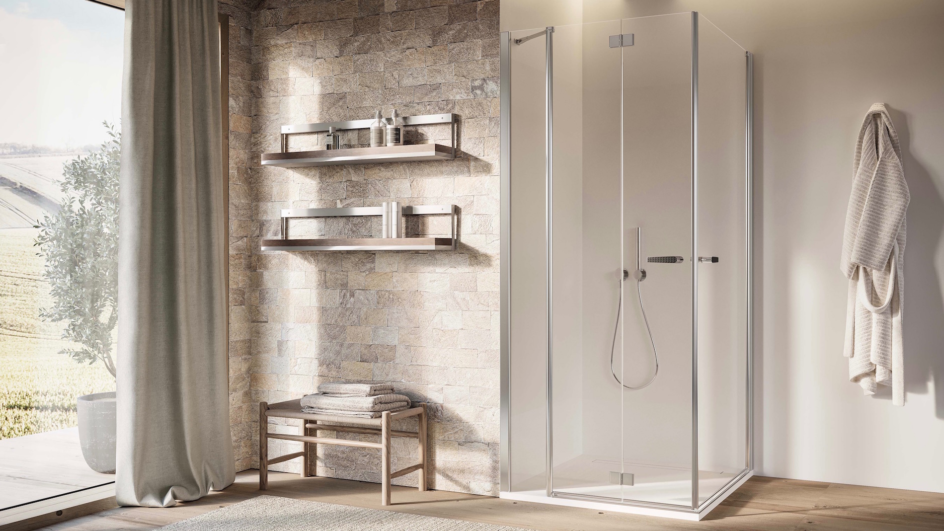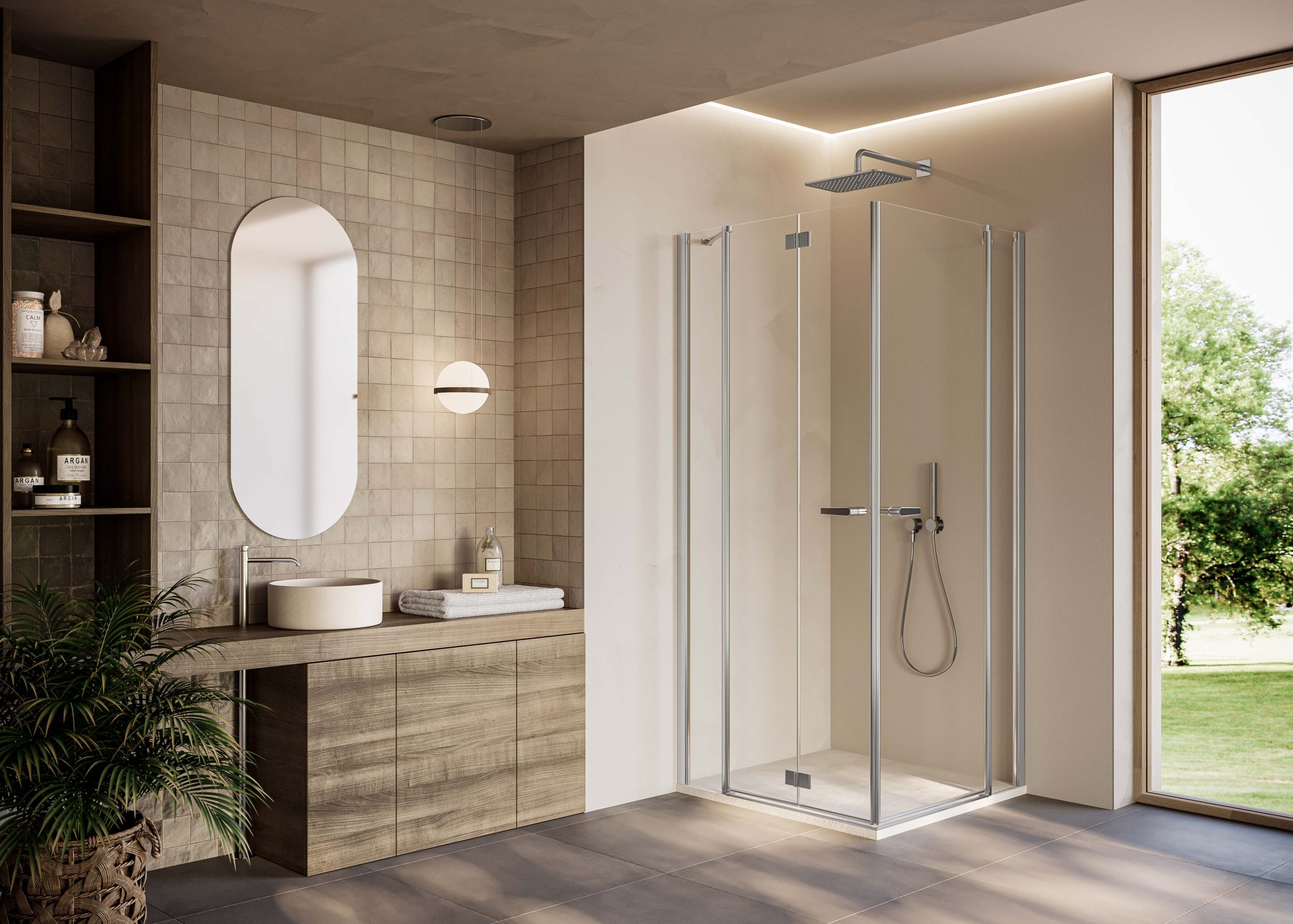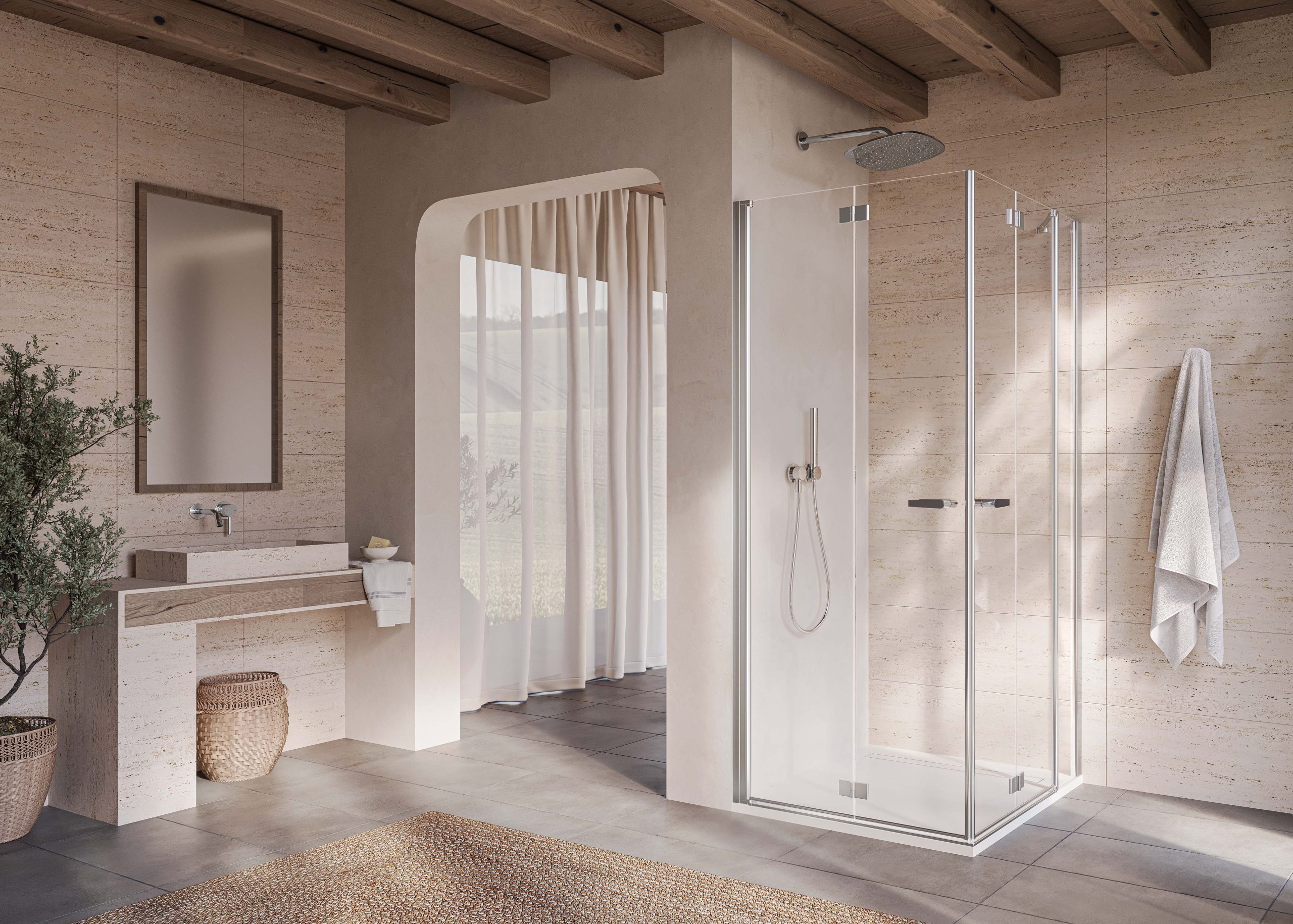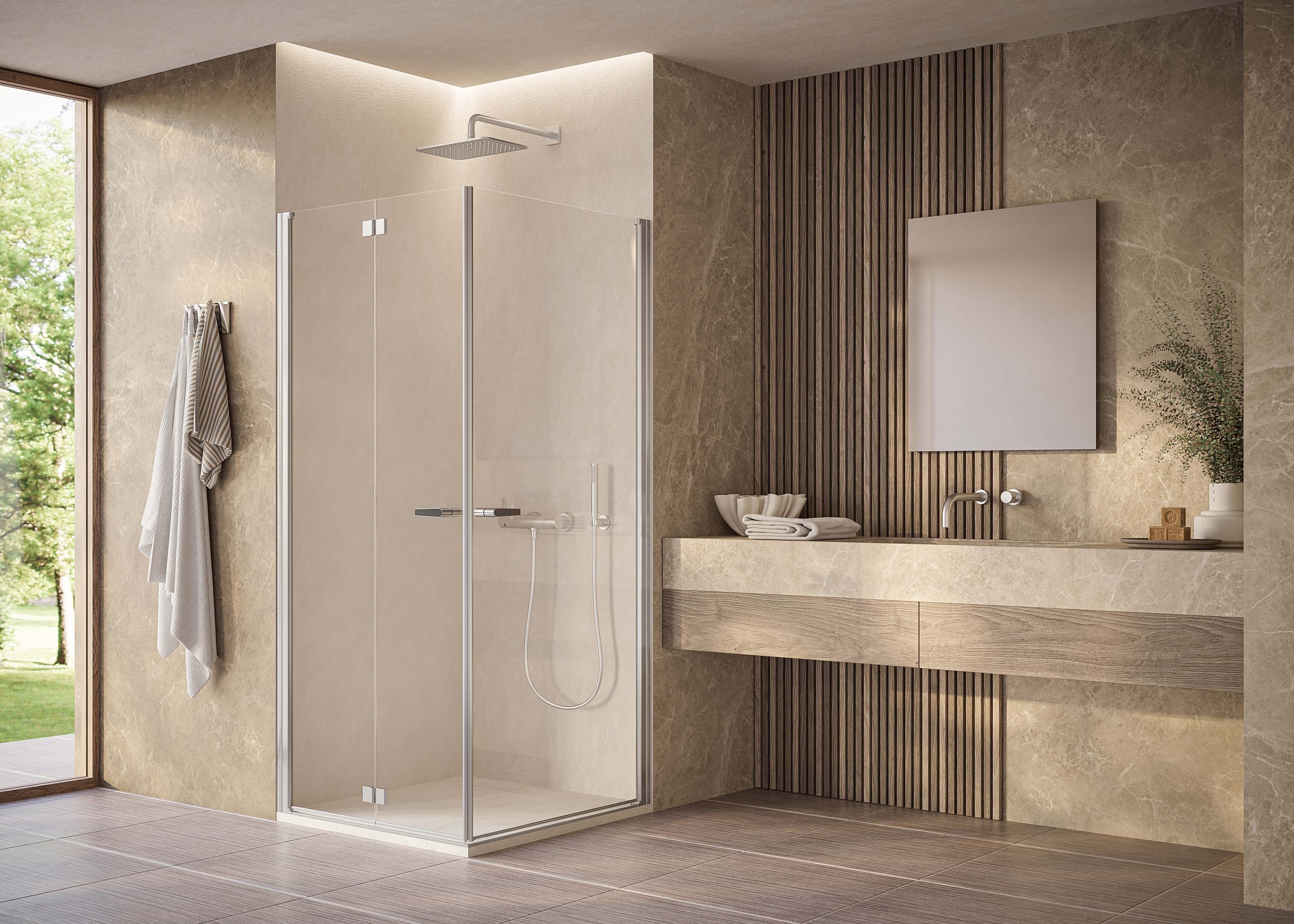 Il nuovo sistema di apertura è stato progettato per garantire fluidità e leggerezza, migliorando l’esperienza d’uso quotidiana. Le due modalità diventano ancora più funzionali quando vengono abbinate a un elemento fisso, offrendo ben quattro possibilità di ingresso allo spazio doccia: porta a soffietto battente, a soffietto battente con elemento fisso, porta a battente e a battente con elemento fisso.