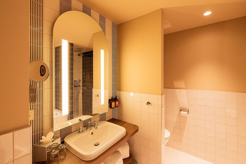La “Red Light Suite” con champagne bar integrato e la camera “Unwind” a ispirazione zen dimostrano come il design Duravit possa adattarsi a registri espressivi distinti attraverso la personalizzazione dei rivestimenti ceramici e delle finiture superficiali.