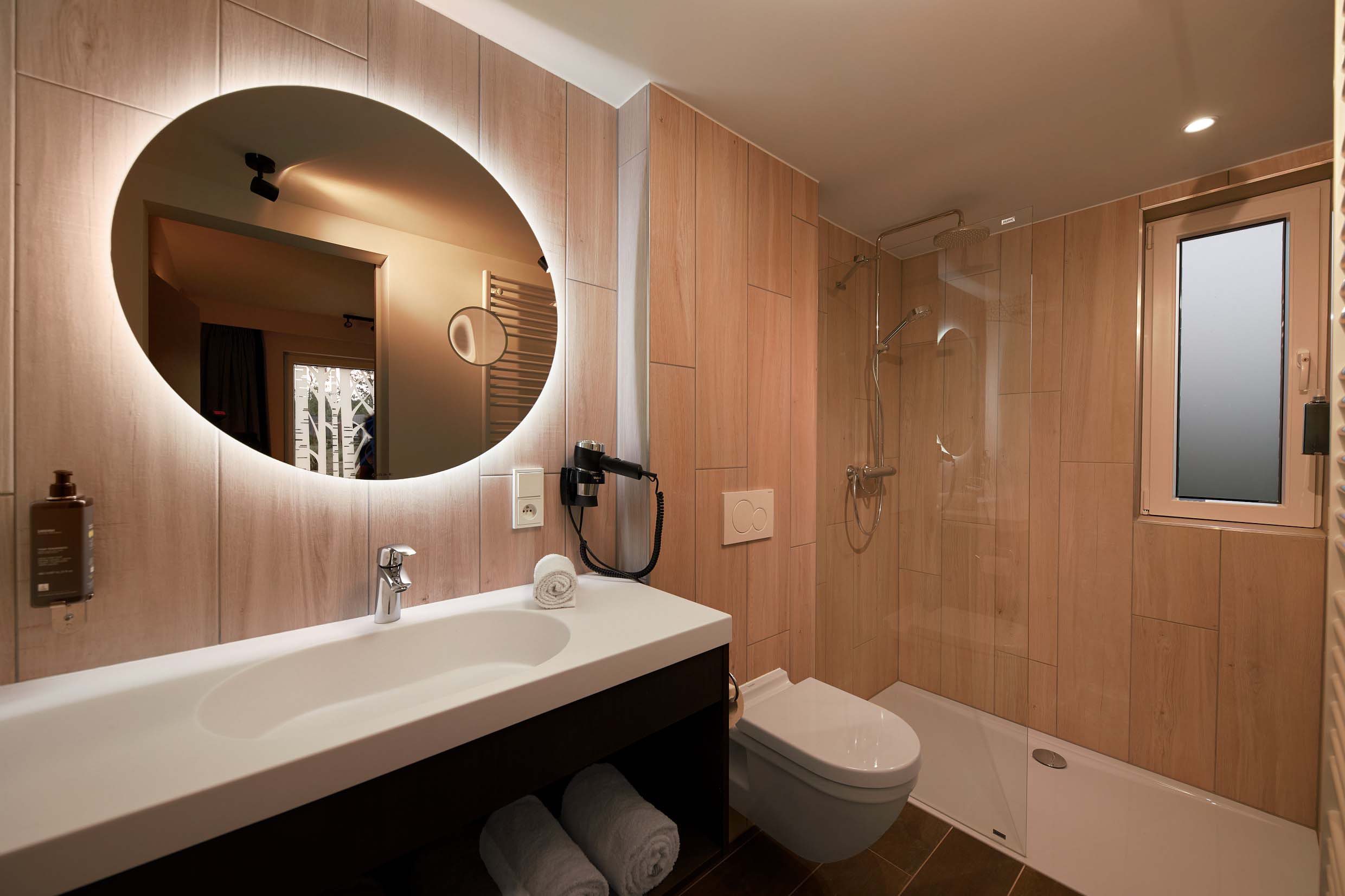 Nei bagni dal design personalizzato sono a disposizione dei visitatori i lavabi Duravit delle serie Starck 3 e D-Code dalle forme eleganti e ricercate. Oltre ai lavabi, a Terhills sono installati diversi vasi sospesi Starck 3.