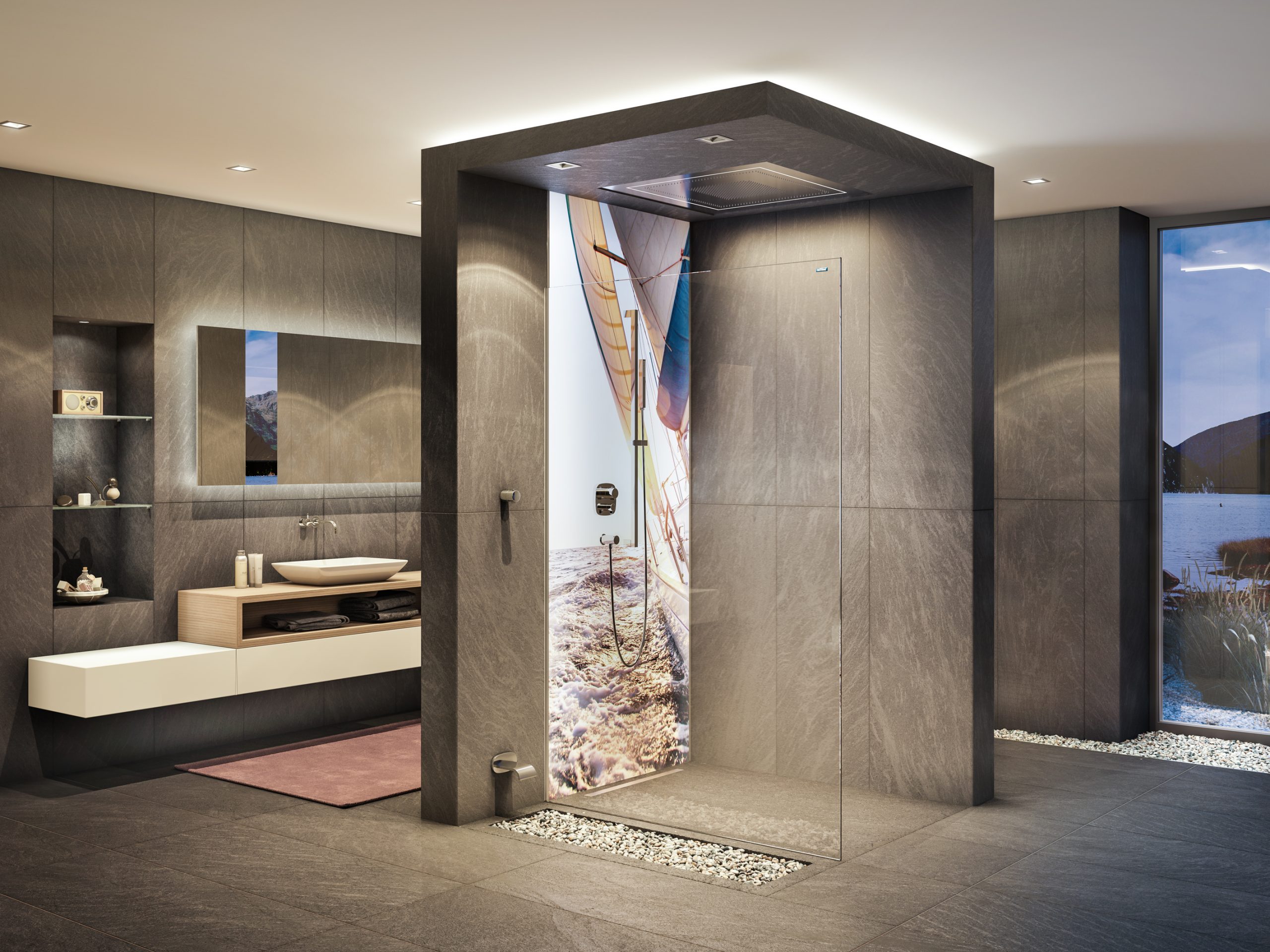 Il profilo a parete sottile di Duscholux Air 2 può essere incassato, mentre il profilo invisibile ultrapiatto a pavimento viene fissato con uno speciale collante, creando l’illusione di un cristallo sospeso nello spazio.