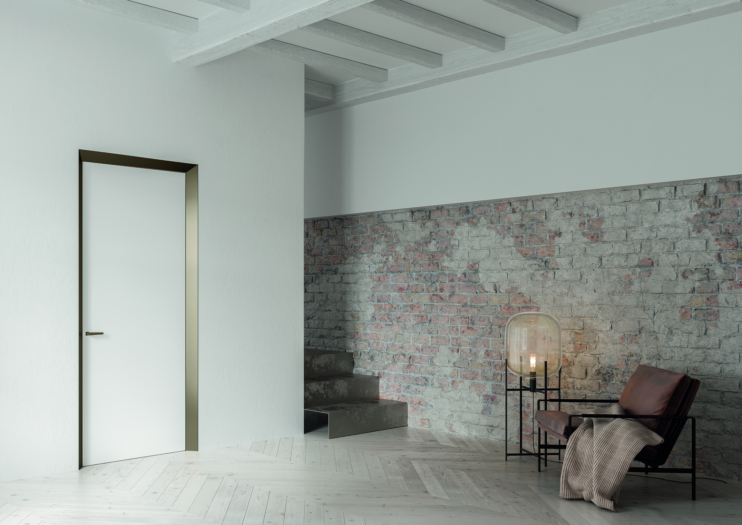 Il prodotto presenta una particolare strombatura a 40 gradi della struttura che definisce il volume della soglia, dando alla porta una presenza e una forza espressiva unica. Un nuovo modo di immaginare la porta, che mantiene nel lato opposto l’aspetto filo muro, e come tale può essere mimetizzata come la parete oppure ricoperta con la carta da parati.