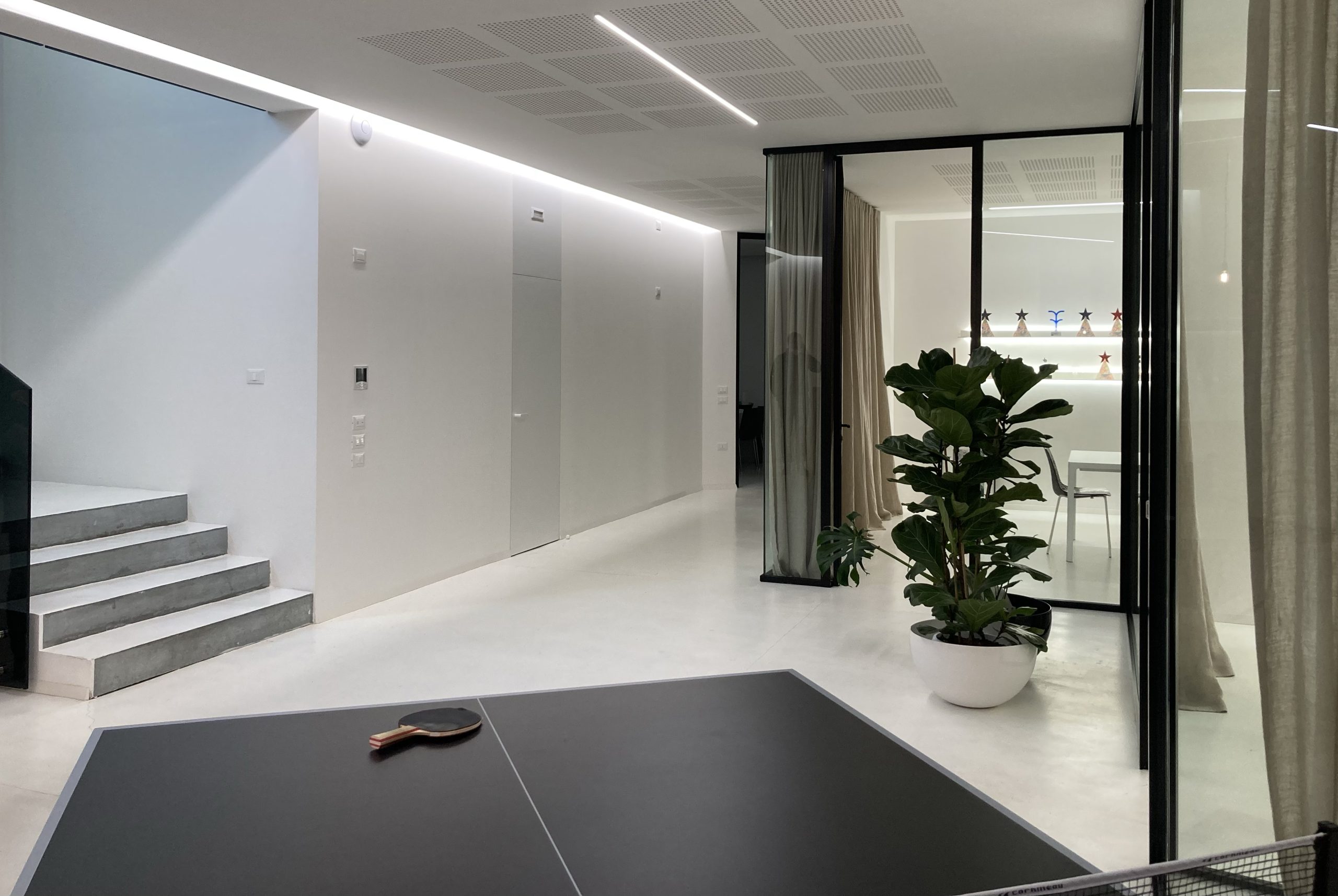 Per ampliare i propri spazi aziendali ottimizzando il piano interrato di 270 m², fino ad allora completamente inutilizzati, l’agenzia di comunicazione Fk Design si è rivolta all’architetto Gilberto Toneguzzi. Federico Frasson, titolare dell’agenzia pubblicitaria, aveva bisogno di sfruttare l’estesa metratura per ricavarne una sala posa e video indipendente, due stanze riunioni e un’area svago, oltre al magazzino.