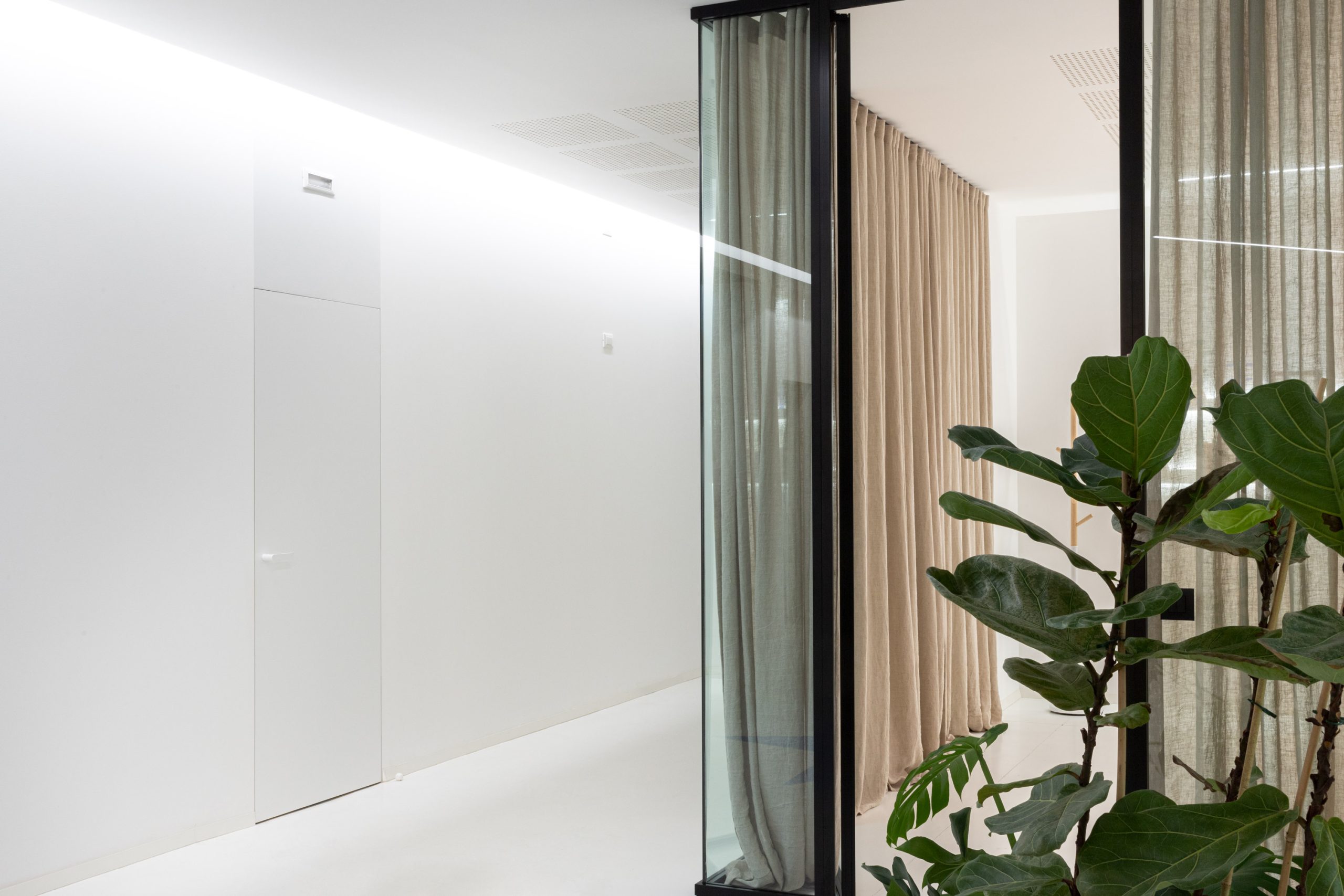 La stessa laccatura delle porte è stata riproposta anche nella parte alta che separa la stessa dal soffitto in modo da creare un’unica fascia verticale che dà slancio e rafforza la presenza discreta delle aperture.