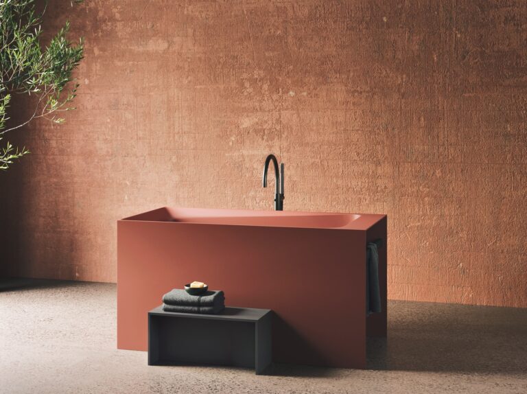 Sul lato opposto della stanza è stato ricavato un bagno dietro una parete di metallo nero traforato con motivi art déco. Dalla vista frontale è ben evidente la sagoma del tetto a spiovente. Il bagno è accuratamente progettato con spazi di contenimento capienti ma sempre discreti: nicchie per i saponi nella doccia e un armadietto a specchio accanto alla toilette.