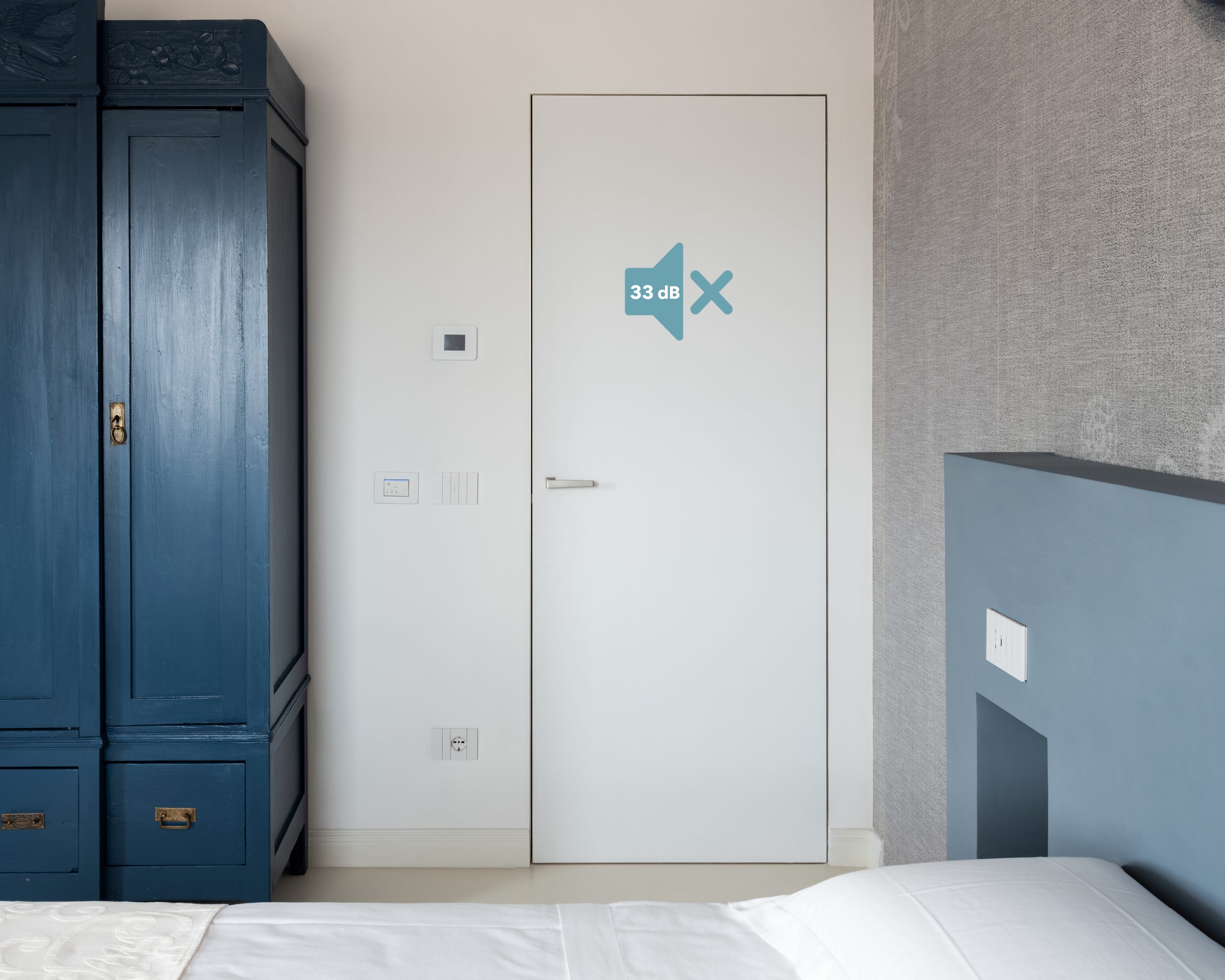 Il kit per porte battenti filomuro acustiche comprende: un pannello porta fonoisolante sp. 45 mm (finiture disponibili: grezzo con primer o laccato opaco colori Ral); guarnizioni acustiche da applicare in fase di posa; paraspiffero inserito nella fresata inferiore del pannello porta: si alza e si abbassa ad ogni apertura e chiusura della porta battente.