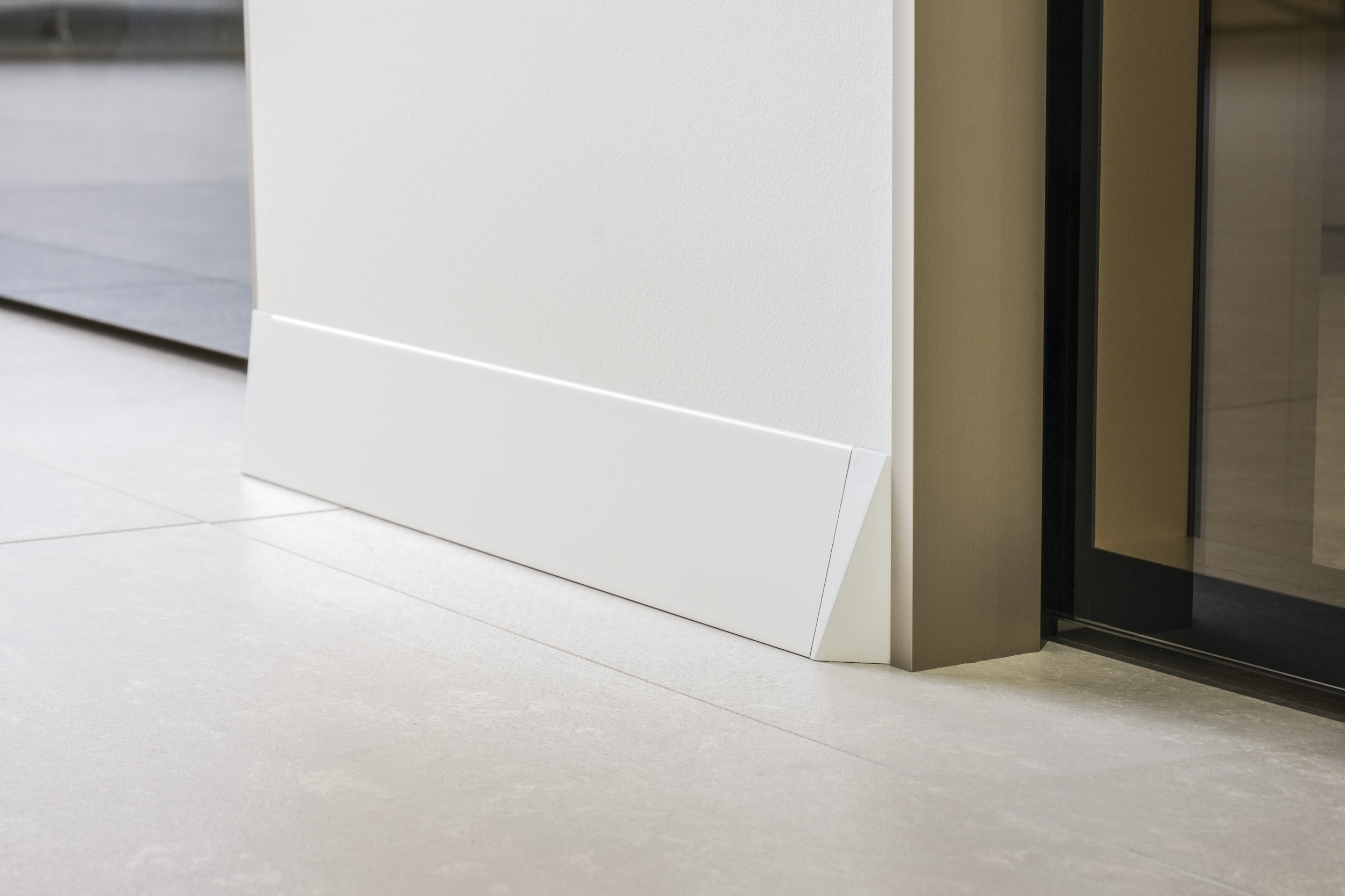 Se visto frontalmente, il battiscopa Eclisse percorre la parete con discrezione. Da una vista laterale rivela invece il suo carattere: l’inclinazione dona carattere all’ambiente.