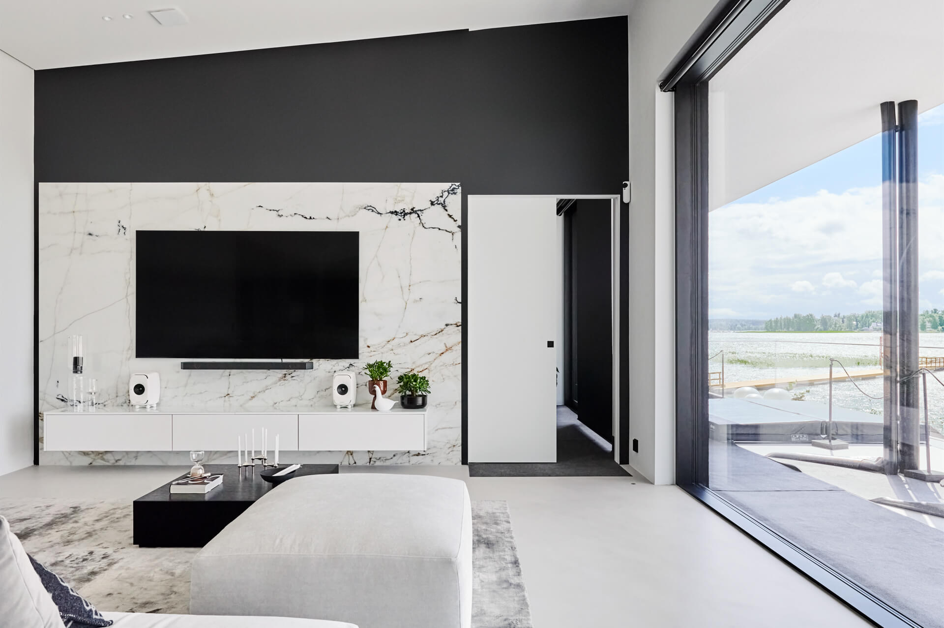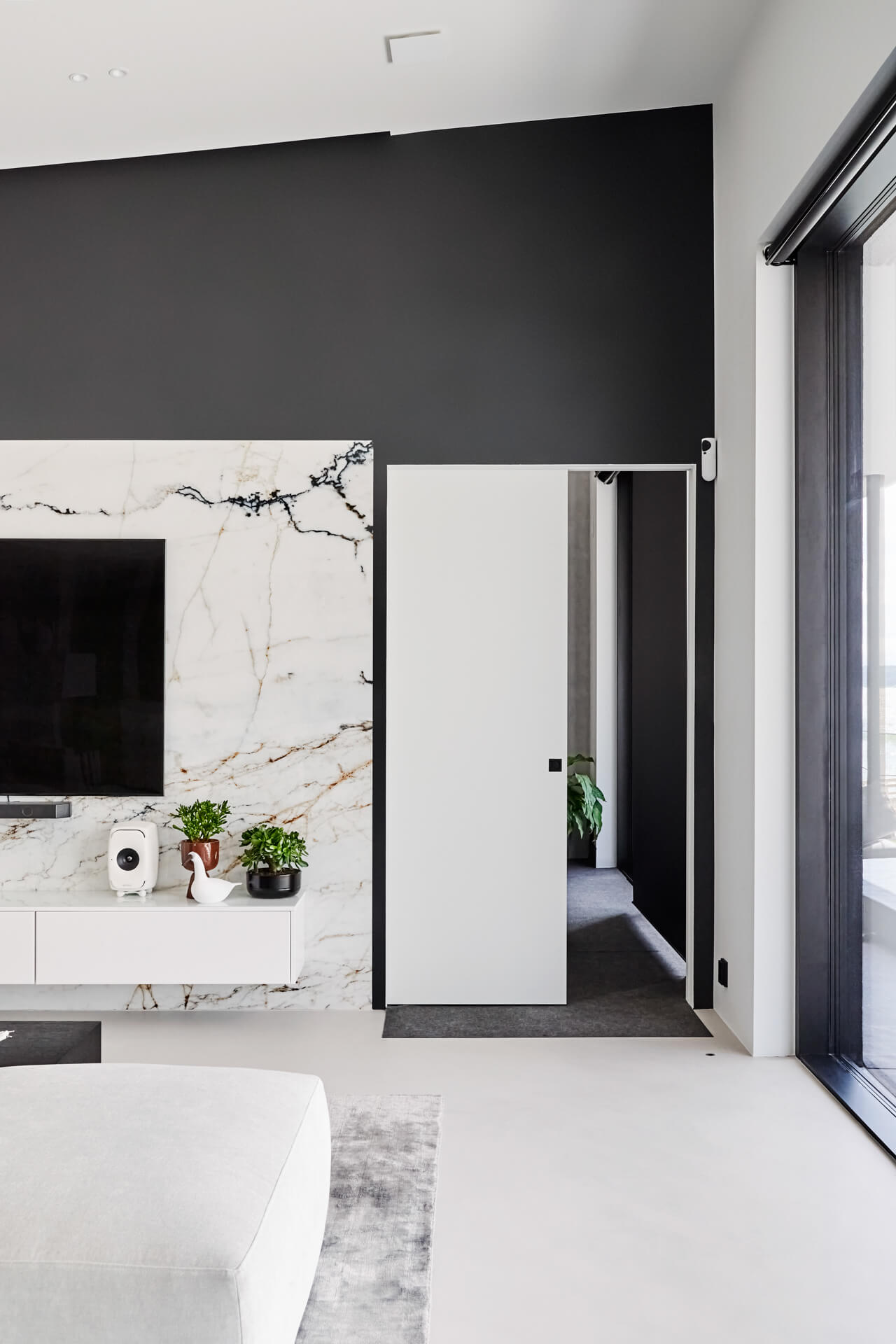 Eclisse, attraverso il distributore finlandese Muotolevy, ha fornito delle soluzioni per porte a scomparsa. In particolare, in questa abitazione sono stati installati i controtelai per porte scorrevoli filomuro modello Eclisse Syntesis Line scorrevole. Le porte appaiono dunque completamente prive di finiture esterne, una scelta che sottolinea nuovamente la pulizia delle linee e lo stile essenziale di questa abitazione.