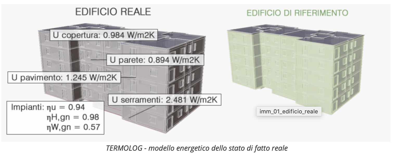 Si valutano gli stessi indici di prestazione e le efficienze dei singoli servizi considerando l’edificio di riferimento, ovvero un edificio identico per clima, dimensione ed esposizione a quello reale, ma con caratteristiche termofisiche e di rendimento definiti dalle tabelle riportate nel DM 26/06/2015 (DGR 967 in Regione Emilia Romagna, dalla D.d.U.O. 18546/2019 per Regione Lombardia).