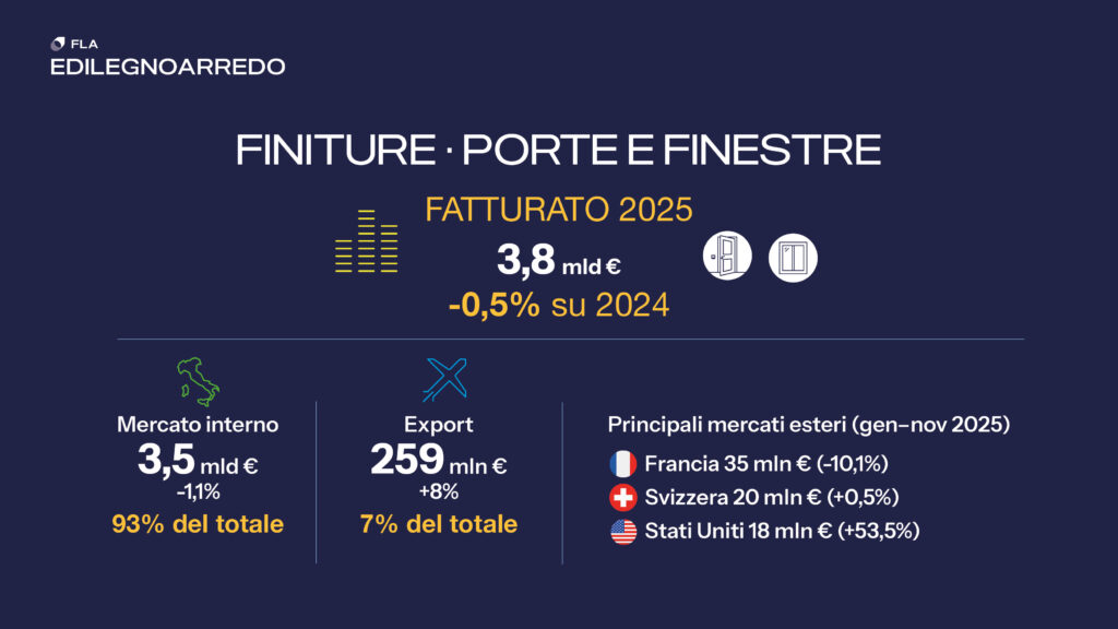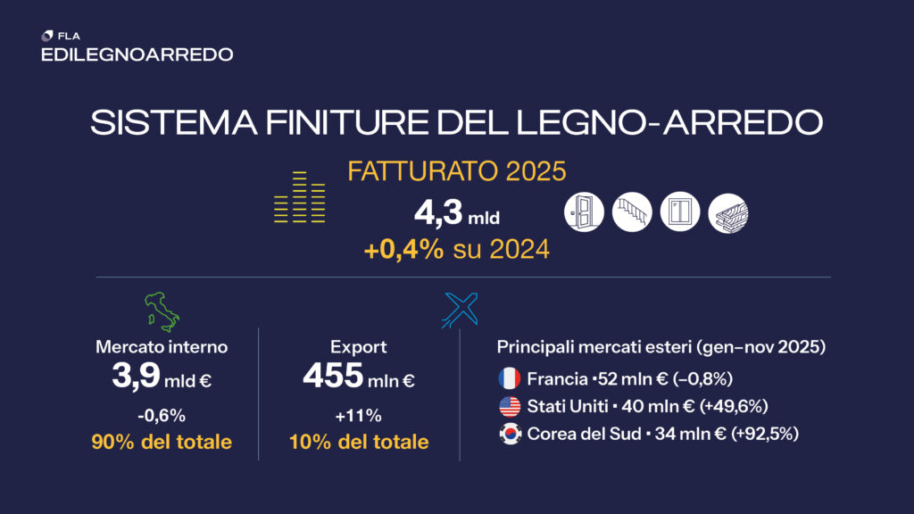 Il comparto — che comprende pavimentazioni e rivestimenti in legno, finestre in legno e legno-alluminio, porte interne e porte d’ingresso — chiude il 2025 con un fatturato alla produzione superiore a 4,3 miliardi di euro, in crescita dello 0,4% rispetto all’anno precedente.