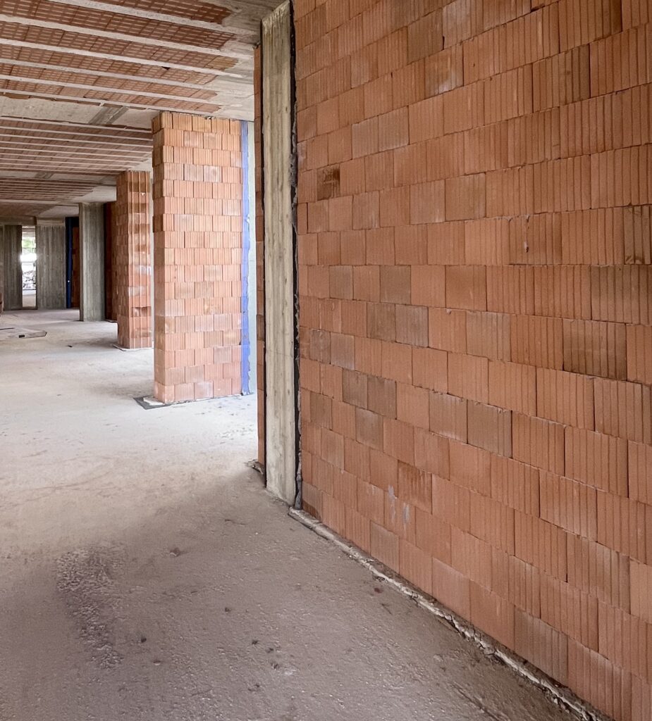 La scelta del laterizio rettificato da tamponamento Porotherm Bio Plan 45 T9, da 45 cm di spessore, si è rivelata strategica per diversi motivi. In primo luogo, il blocco rettificato garantisce prestazioni termiche elevate (λ = 0,09 W/mK), contribuendo all’ottenimento della certificazione nZeb (Nearly Zero Energy Building).