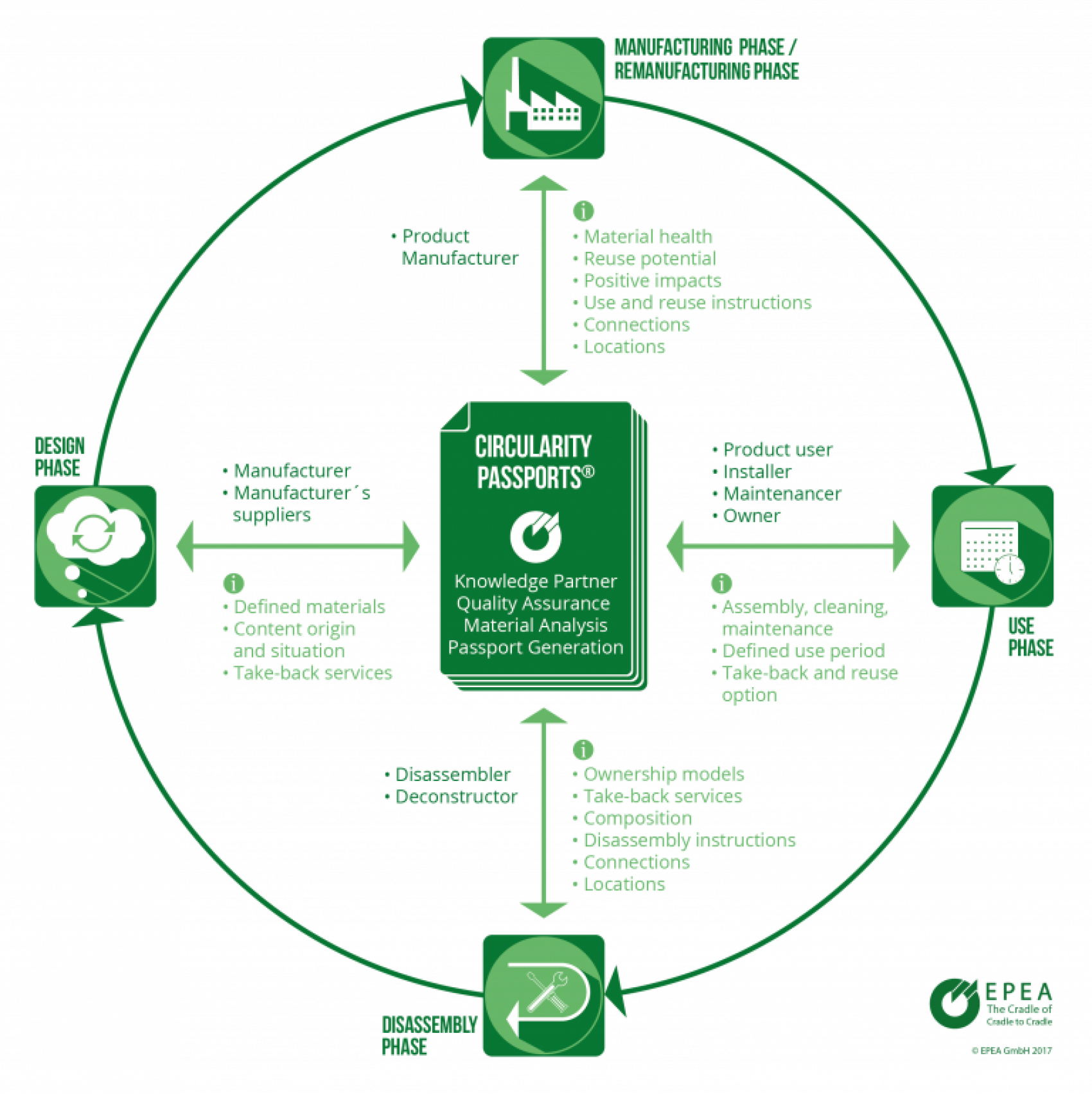 Vi è poi l’adozione di strumenti per la gestione del fine vita e della tracciabilità di prodotti e materiali, elemento che costituisce la quarta azione chiave da mettere in campo. Una necessità questa dettata dal fatto che i vari prodotti derivanti dagli edifici esistenti, seppur oggetto di demolizione selettiva, sono ancora classificati facendo riferimento a categorie generali (inerti, metalli, plastiche, eccetera), senza un riconoscimento della loro composizione materica e delle caratteristiche comportamentali. Un aspetto che non facilita il riciclo dei materiali e che può essere superato ricorrendo e utilizzando altri strumenti come ad esempio dei material passport, dei certificati di identità che descrivano tutte le caratteristiche di ogni singolo prodotto, come i Circularity Passports (vedi foto sotto) messi a punto da Epea, azienda dei Paesi Bassi attiva nel campo dell’economia circolare.