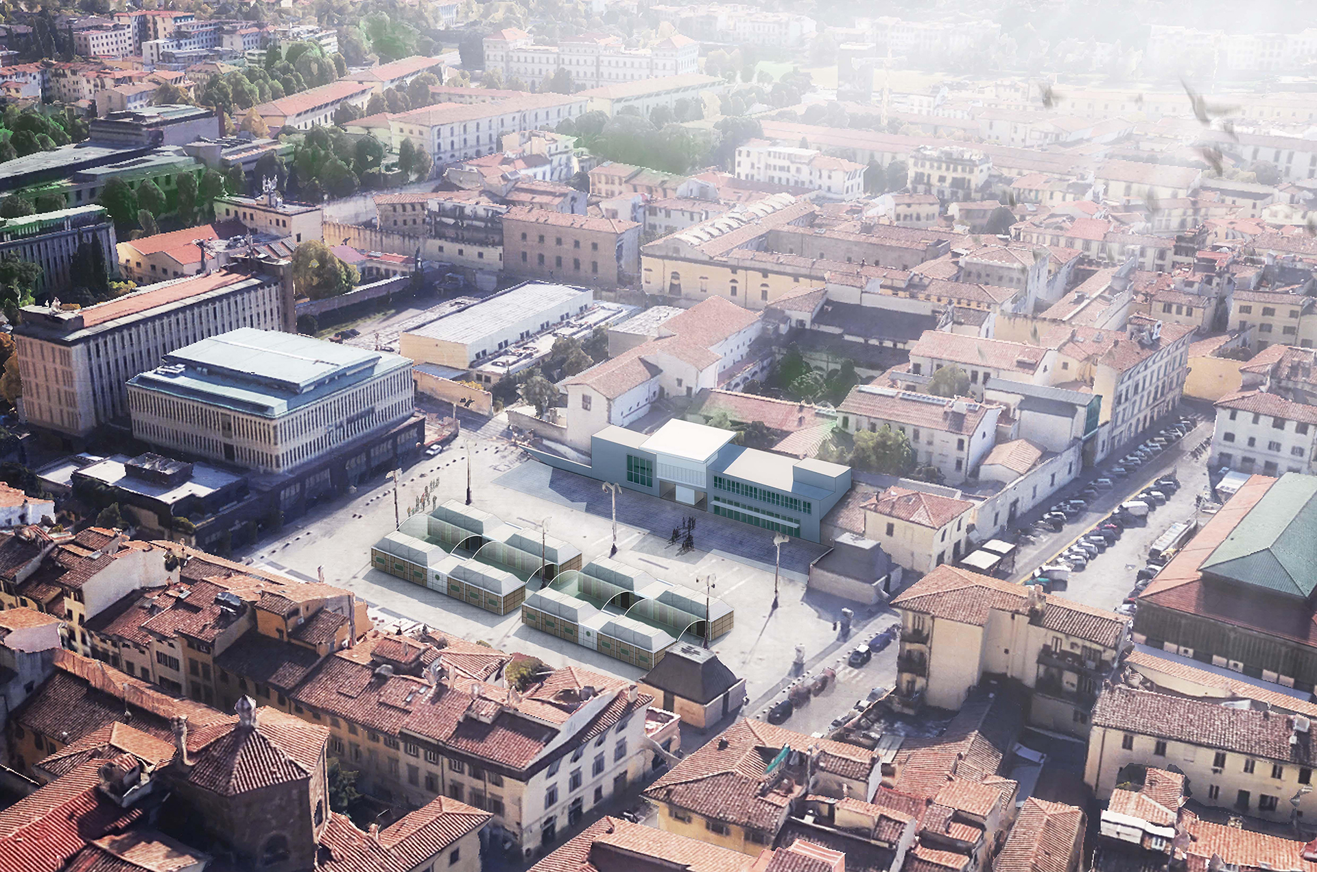 In questa prospettiva si colloca il nuovo Mercatino delle Pulci che sul fronte opposto amplifica a effetto urbano i due padiglioni esistenti progettati dall‘arch. Natalini per l‘accesso al parcheggio, in modo da ospitare la quota del mercatino antiquario da allocare in fondi permanenti.
