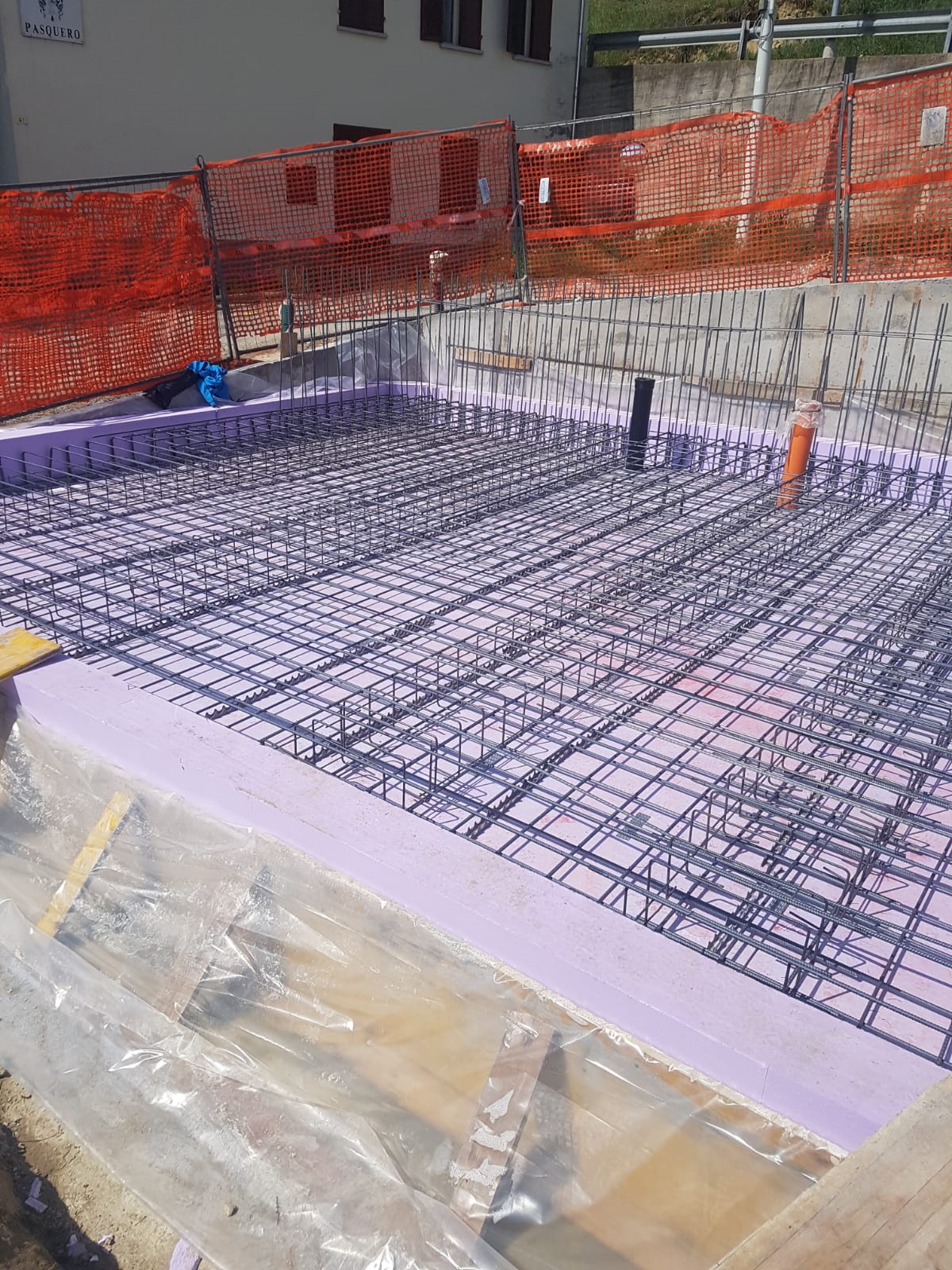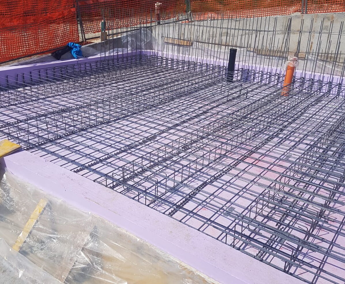 Per questa ragione, dopo la demolizione e lo scavo, è stata realizzata una prima platea di fondazione con i pali (come un grande vascone) a sostegno della strada comunale e del marciapiede, poi è stato posato l’isolante con spessore 20 cm e già risvoltato per la continuità del cappotto da 24 cm, su questo è stata realizzata la platea di fondazione della casa.