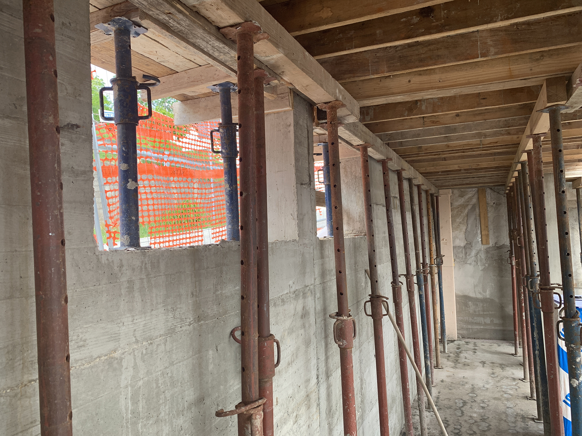 Sul lato nord, dalla platea al piano primo, il muro è in cemento armato con solaio in cemento sulla zona cuscinetto che ospita la lavanderia/locale tecnico, l’antibagno, il bagno e il guardaroba (h interna 246 cm). Questo solaio si trova a una quota più bassa rispetto a quello in legno per l’appoggio delle travi in legno. Gli orizzontamenti sono quindi stati realizzati in legno e cemento.