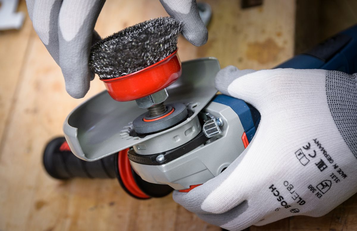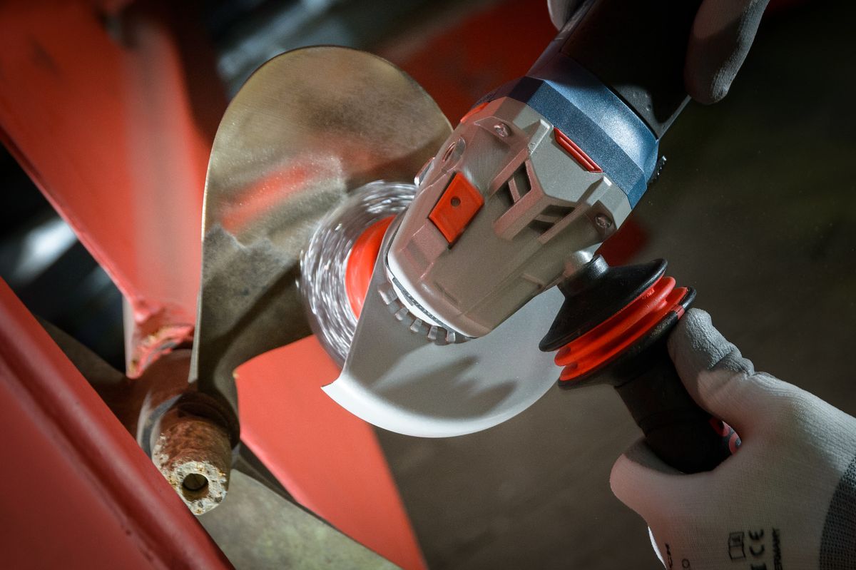 La smerigliatrice angolare Gws 19-125 Cie Professional. Anche l’elica dello yacht a motore «Hildegard» ha risentito dei molti anni in mare. Con la potente smerigliatrice angolare Gws 19-125 Cie Professional, il cantierista navale Lukas Weigelt può rimuovere i depositi di calcare in modo veloce ed affidabile. A questo scopo, utilizza una spazzola specifica per lavori su metallo, e grazie al motore da 1.900 Watt la smerigliatrice angolare opera con potenza e velocità, senza asportare eccessivamente la delicata superficie.