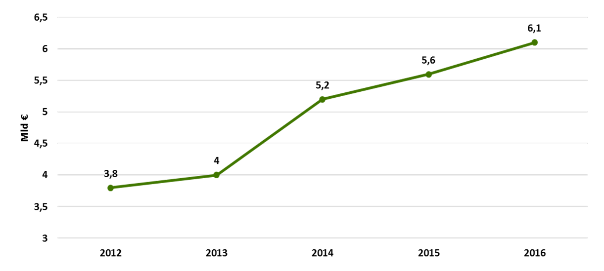 Il trend degli ultimi 5 anni si è mantenuto positivo, facendo registrare un CAGR del 12,5% e con una crescita che si è sostanzialmente stabilizzata su buoni livelli (+8% nel 2016 rispetto al 2015).