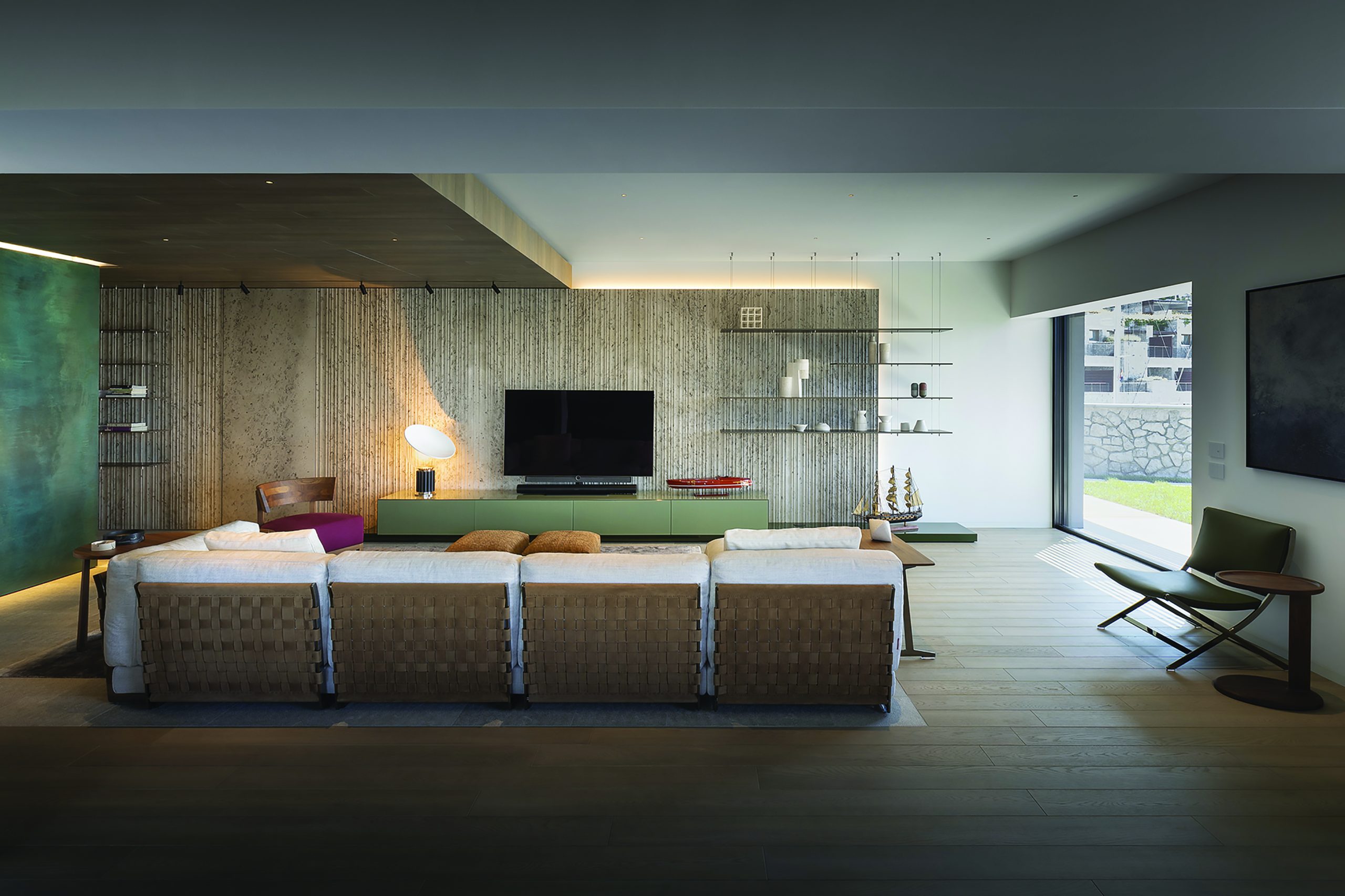 Tre grandi piani materici orizzontali e verticali proiettano la zona living verso l’esterno, legando visivamente l’ingresso, con il soggiorno, al giardino e al mare: il pavimento in pietra Aurisina Granitello, il controsoffitto in doghe di legno e la parete in pietra Aurisina Lumachella lavorata.