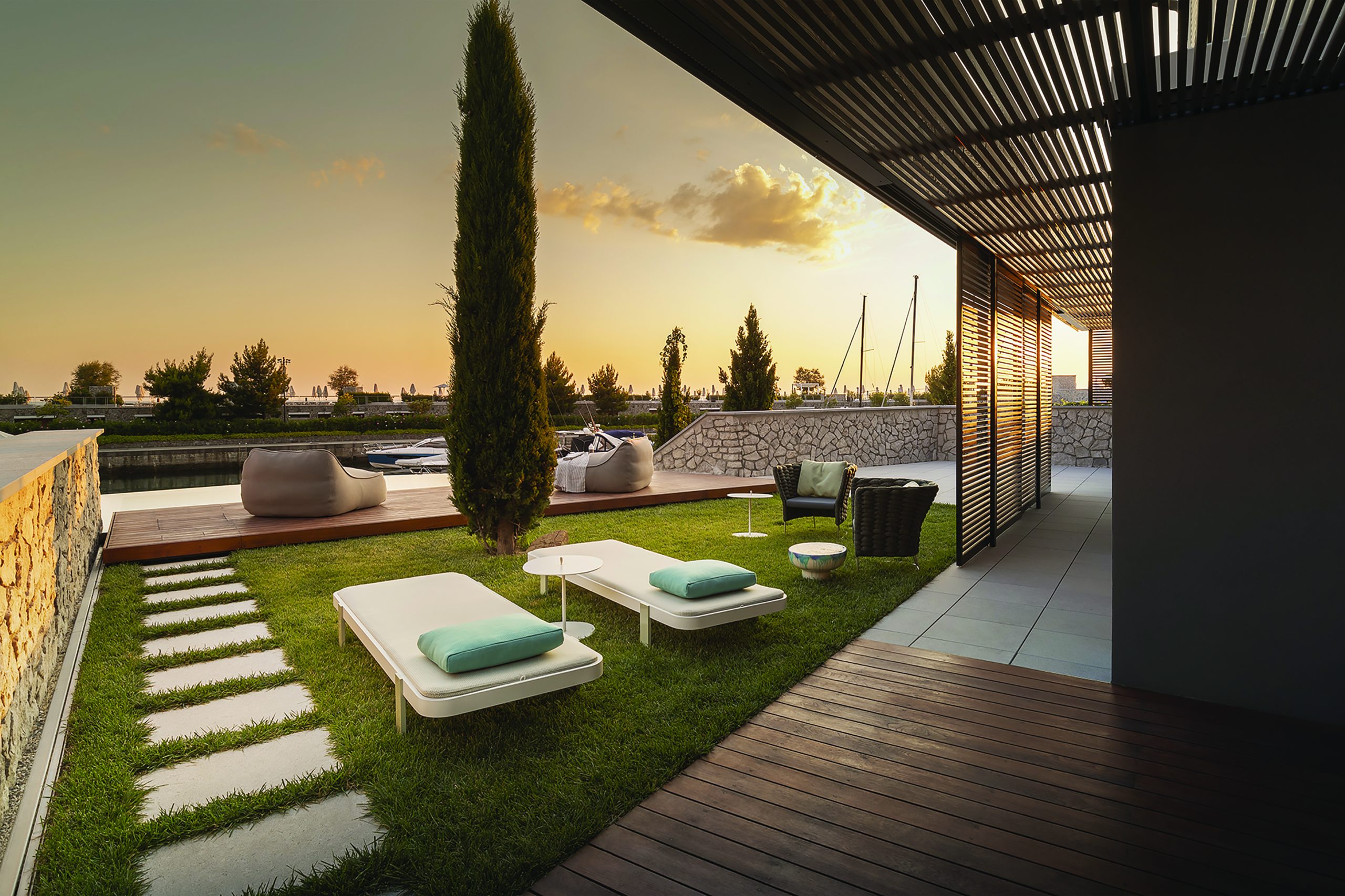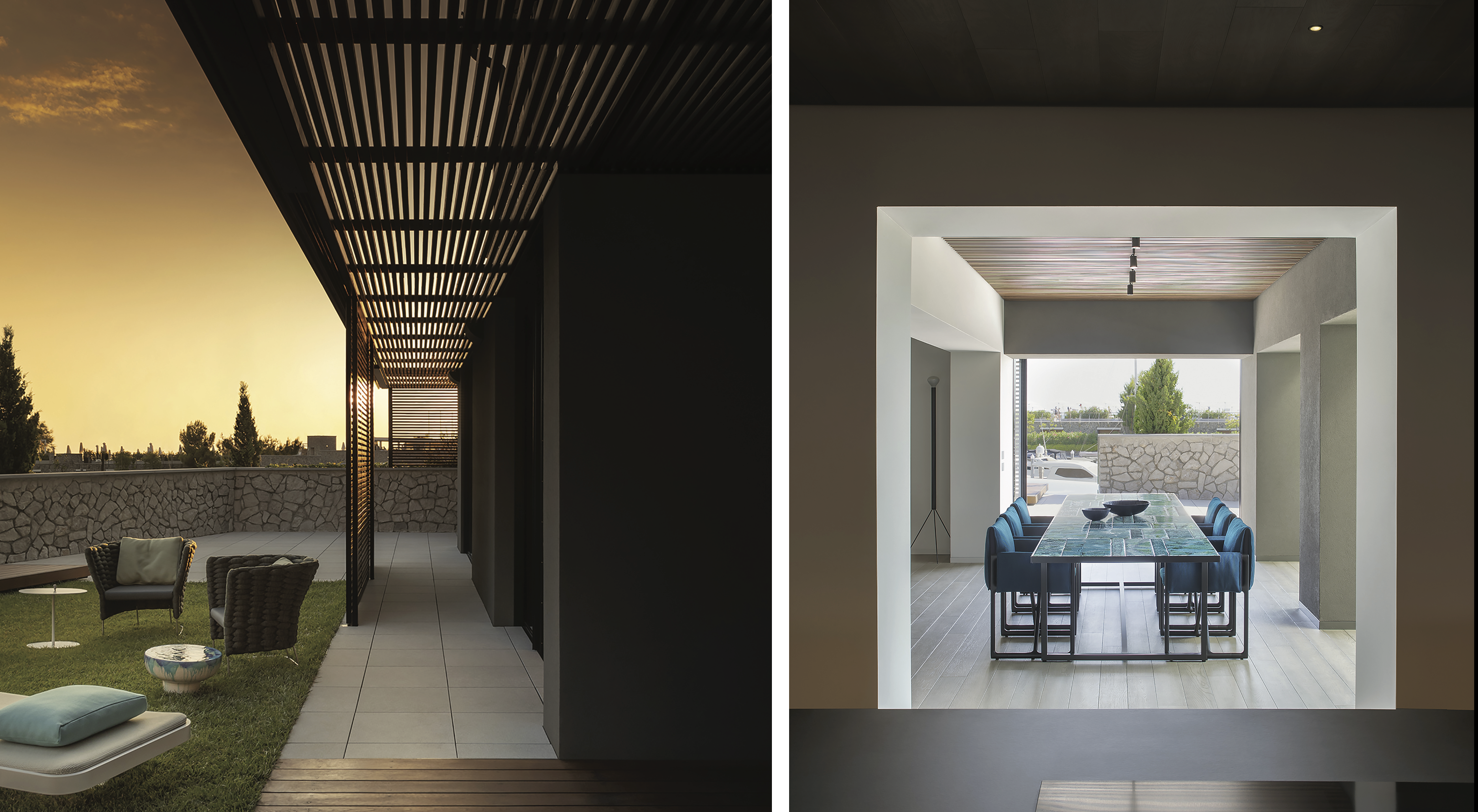 Anche gli esterni sono stati pensati in continuità con gli ambienti del piano terra. Il giardino che circonda la casa su tre lati è stato suddiviso in altrettanti spazi funzionali, con la piscina a sfioro, che si adatta alla conformazione della proprietà e crea una continuità visuale con il mare antistante, un piano ligneo che funge da prendisole, la zona pranzo con vista e il grande pergolato che circonda la casa e che genera, grazie a una tettoia filtrante realizzata con listelli di teak, un elegante gioco di luci e ombre.