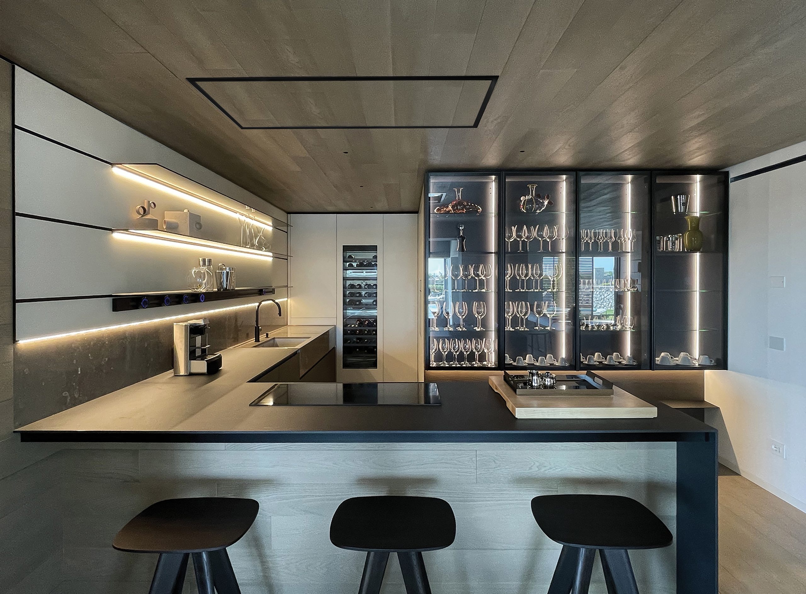 Il piano interrato, che permette l’accesso al molo, è un open space dedicato allo svago; ospita una cucina, un’area living, un grande tavolo e una sala di home cinema, due camere ospiti e i bagni. Grazie a un impegnativo lavoro di demolizione della roccia preesistente è stata ricavata una cantina per i vini a forma semicircolare.