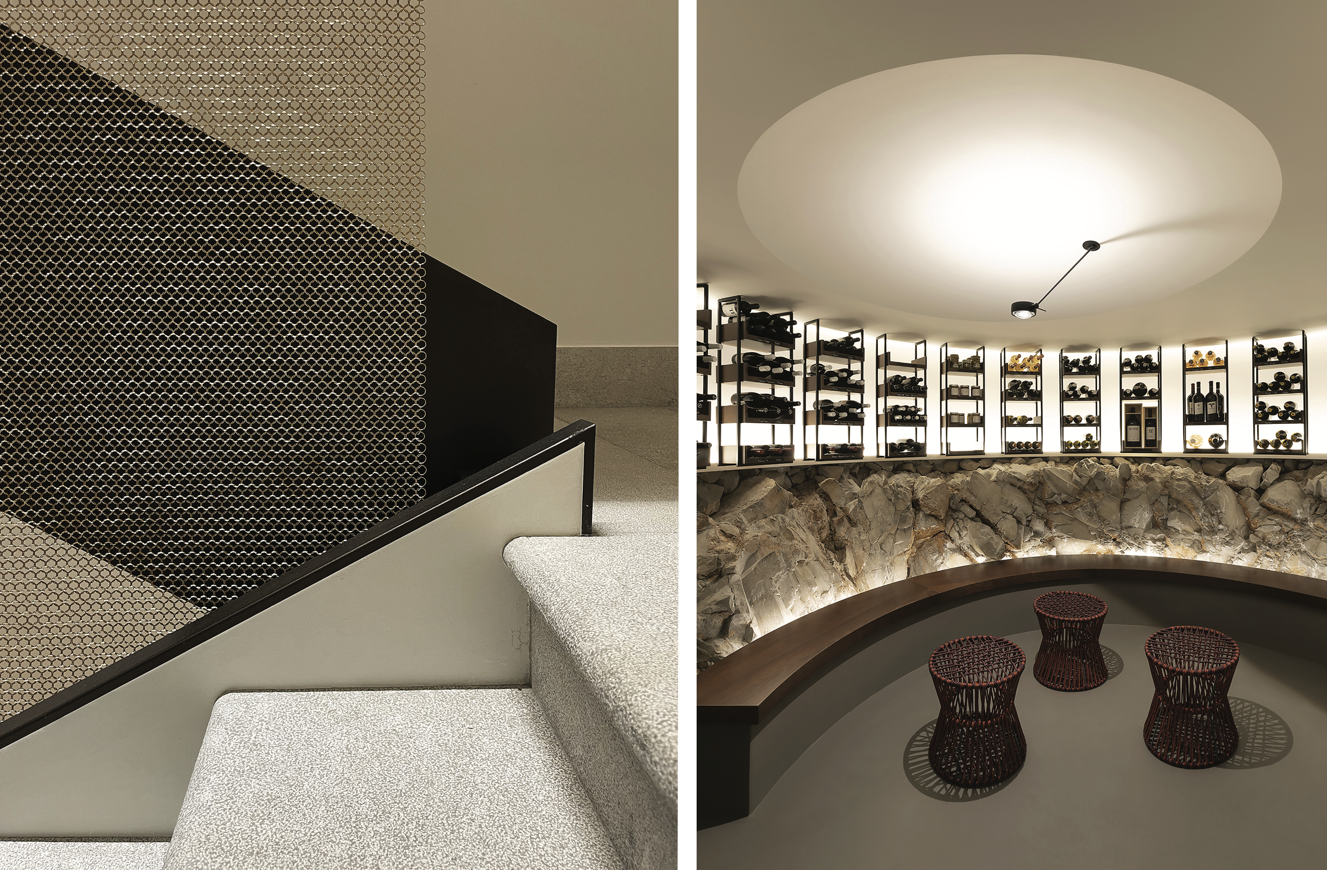 A sinistra, dettaglio della scala con la maglia metallica ramata. A destra, nella cantina per i vini l’illuminazione gioca un ruolo fondamentale per dare enfasi e teatralità all’ambiente (foto di Beppe Brancato)