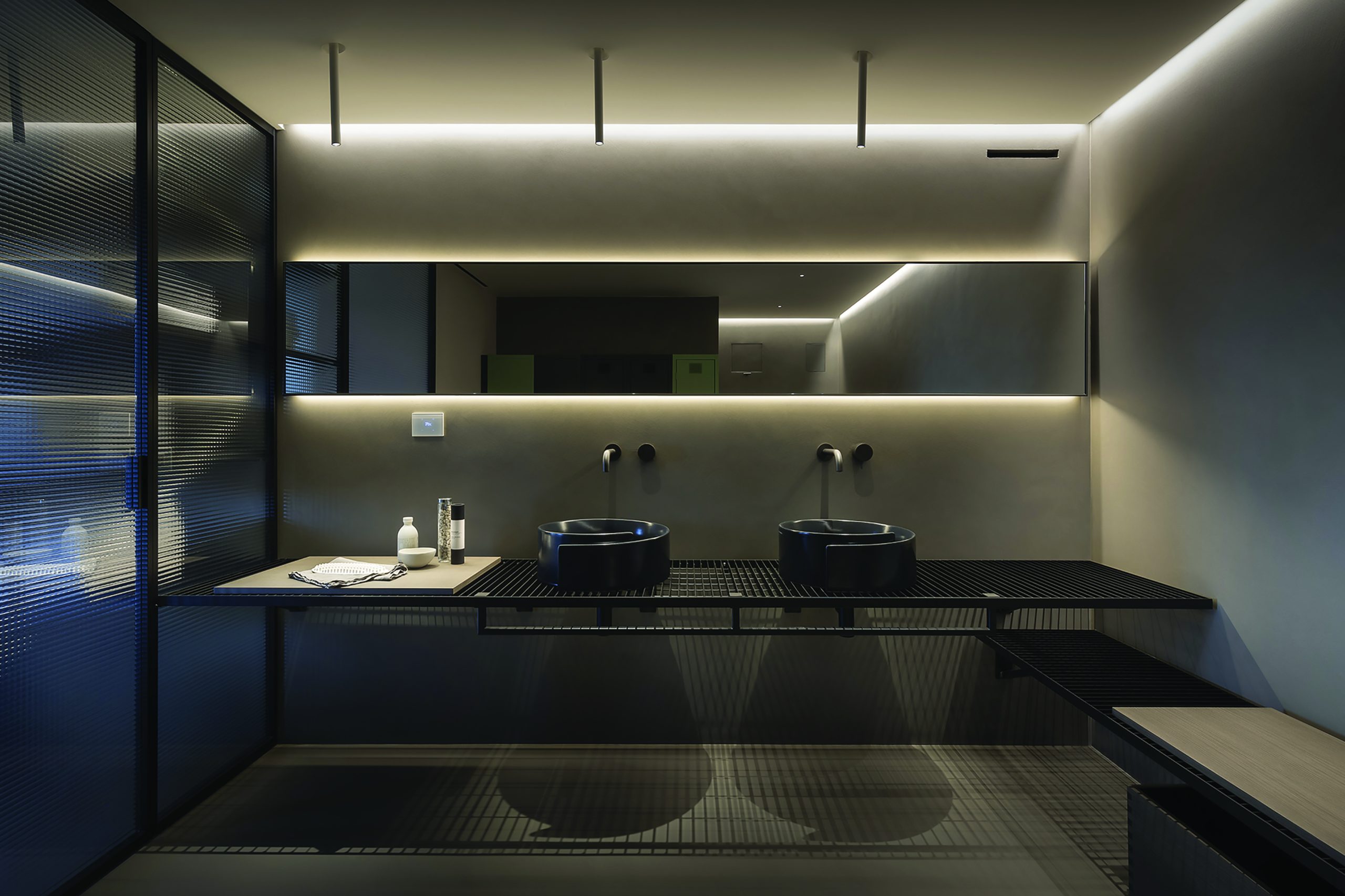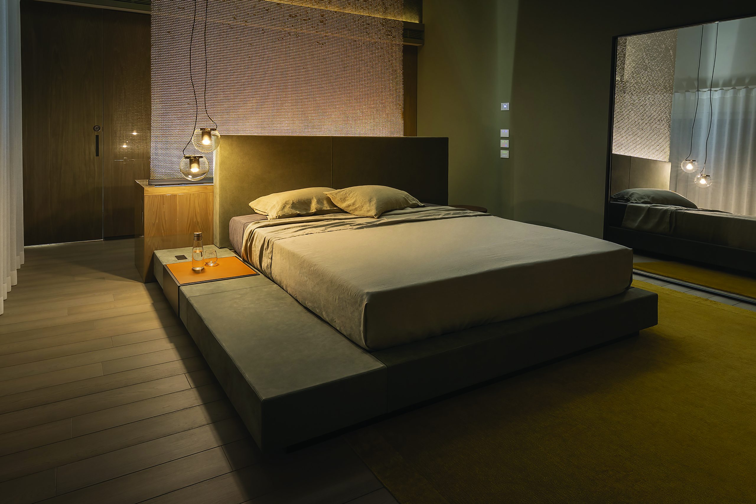 Dal soggiorno si accede al primo piano mediante l’ascensore o la scala, caratterizzata da un telo di maglia metallica color rame. Al piano superiore il disimpegno separa le camere degli ospiti con i relativi bagni dalla camera padronale, una suite indipendente dove gli arredi, progettati su misura, distribuiscono gli spazi creando diversi corner funzionali: cabina armadio, zona letto, area colazione, home office, sala da bagno.