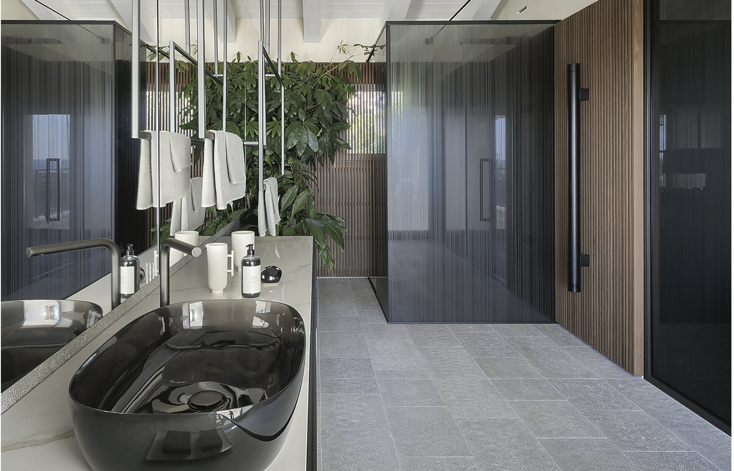 Nel bagno padronale la pietra aurisina riveste il pavimento. La neutralità dei grigi è controbilanciata dal legno materico della parete (foto di Beppe Brancato)