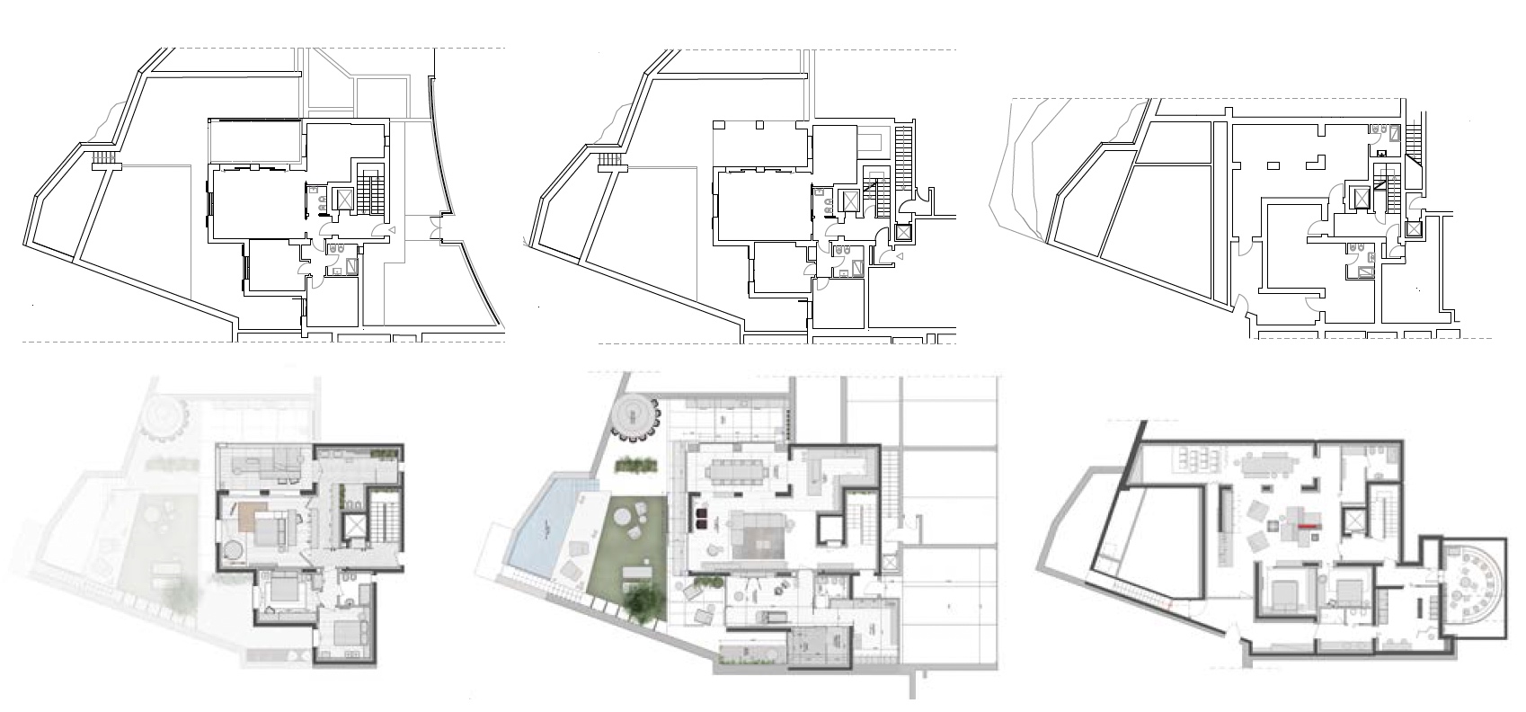 Due unità abitative sono state unite per crearne una unica. Rivista la distribuzione, ma mantenuti scala e ascensore, gli interventi principali dal punto di vista strutturale si sono concentrati al piano terra nell’ampliamento delle vetrate che danno sul giardino, realizzato mediante il taglio della muratura in calcestruzzo scatolare, e al piano interrato, dove al posto di un vano tecnico accessibile da una botola, è stata ricavata una cantina semicircolare grazie alla rimozione di 600 quintali di roccia. All’esterno, da una vasca esistente è stata ricavata la piscina.