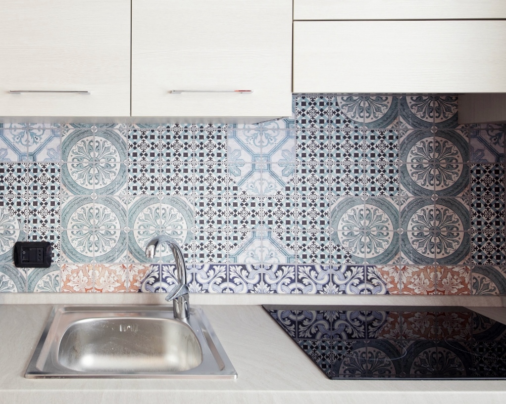 Paraschizzi cucina realizzata con “Le Cementine Collection” di Disegnocontinuo, nuova collezione di Elekta by Gruppo Gani (foto Elekta)