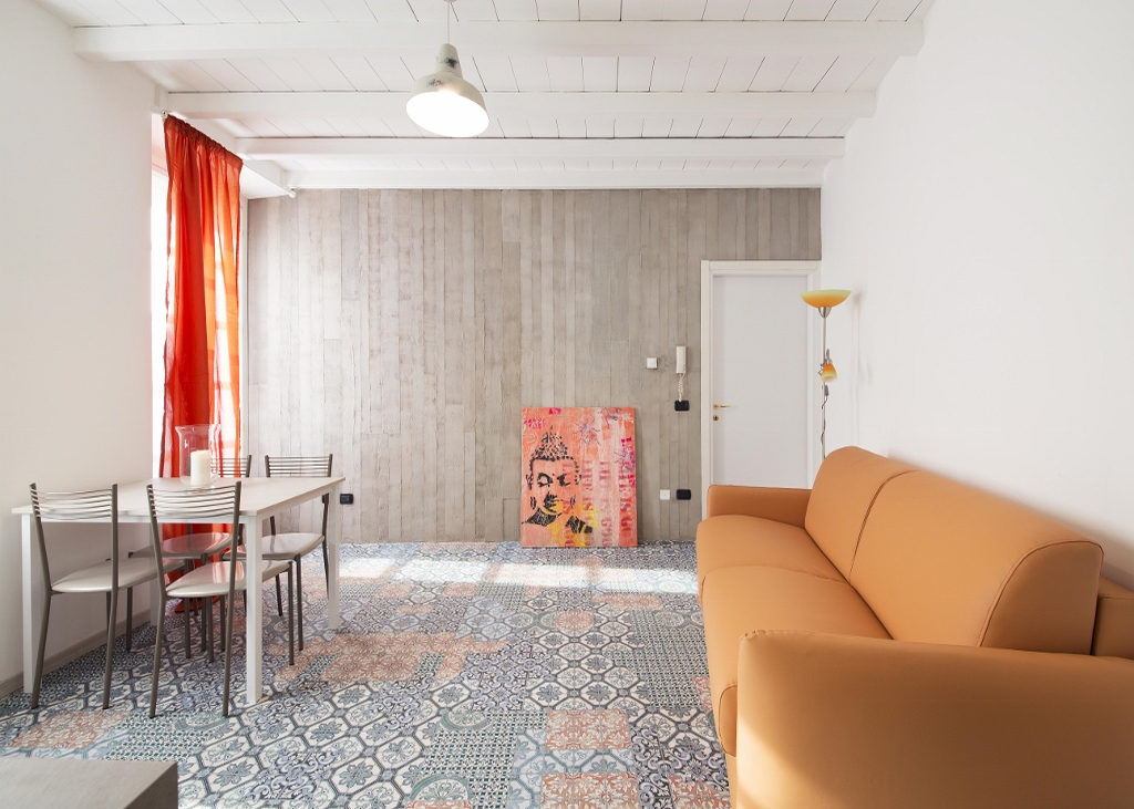 Ambiente living con pavimento realizzato con “Le Cementine Collection” di Disegnocontinuo, nuova collezione di Elekta by Gruppo Gani. (foto Elekta)