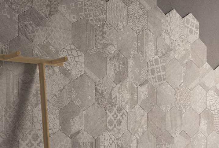Mentre Dune nasce da molteplici stratificazioni di gesso ottenute con colature materiche poi graffiate e incise fino ad ottenere l’effetto della garza ondulata, Il decoro Patchwork Esagona si ispira ai pizzi e ricami dei tappeti della tradizione tessile sarda, tessuti a mano con filari di legno. I disegni di queste tessiture manuali trasposti sulle piastrelle danno vita ad un decoro sofisticato e ricercato. La collezione, in grès porcellanato, è indicato per interni ed esterni, anche per alto traffico pedonale.