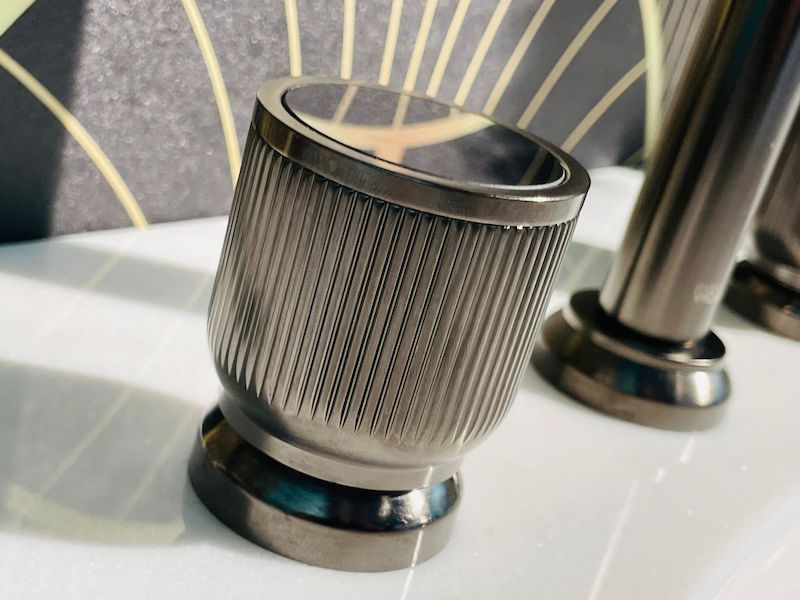 È stata presentata in quattro finiture – nichel lucido, oro spazzolato, cromo nero spazzolato, tabacco – per arredare gli interni più preziosi ed incontrare le richieste del contract.